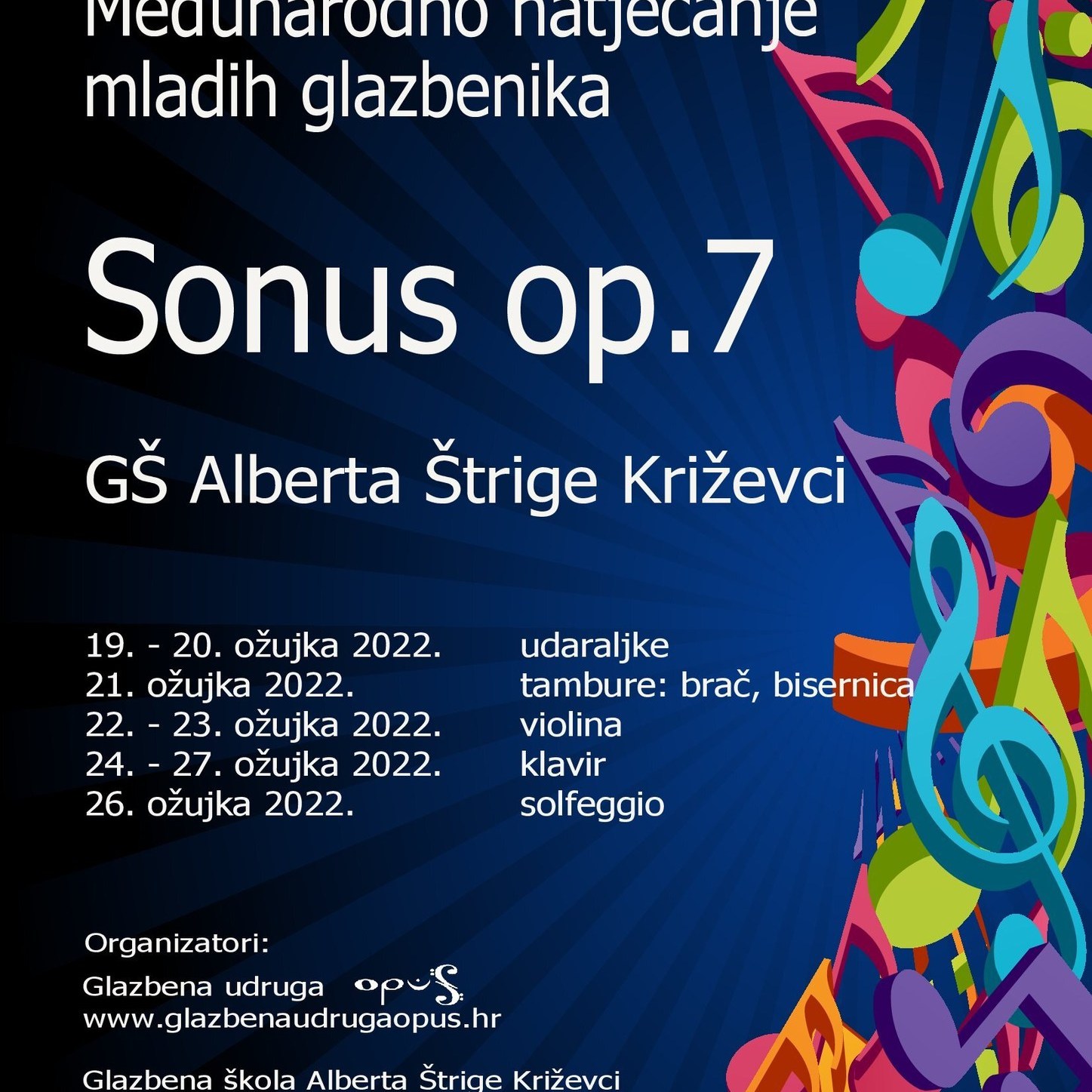 Glazbena udruga Opus i Glazbena škola Alberta Štrige Križevci organiziraju sedmo izdanje Međunarodnog natjecanja mladih glazbenika Sonus koje će se održati od 19. do 27. ožujka u prostorima Glazbene škole Alberta Štrige Križevci.