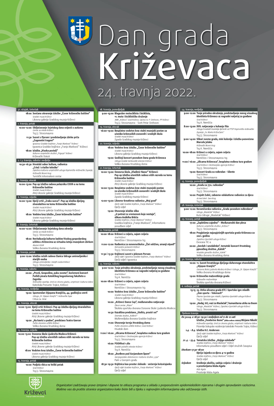 Tijekom travnja će se organizirati besplatne vođene ture gradom i Gradskim muzejom, Sajam cvijeća, plesna natjecanja i otvorenje tornja Hrvatskoga doma, a na Dan grada 24. travnja na Strossmayerovom trgu je koncert grupe Silente.