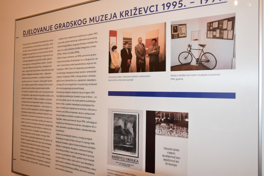 Izložba pod nazivom “Čuvar križevačke baštine – 70 godina Gradskog muzeja Križevci” koja je otvorena do Dana grada, prikazuje nastanak, razvoj, djelovanje i aktivnosti Gradskog muzeja od osnutka do kraja 2021. godine. To je prvi pokušaj da se na jednom mjestu sustavno prikaže njegova cjelokupna djelatnost, svojevrsna muzejska spomenica. Kroz 20 postera ili poglavlja kronološkim je redom opisan rad križevačkih muzealaca, izloženi su arhivski dokumenti, fotografije iz muzejske fototeke, razna muzejska izdanja i ostalo. “70 godina nije svaki dan i stvarno mi je čast da me zapala ova obljetnica i da se ovdje ispred vas mogu obratiti ispred Gradskog muzeja. Od sveg srca hvala svim donatorima koji su gradili ovaj muzej i koji su vrijedno nadopunjavali naše zbirke”, rekla je ravnateljica muzeja Tea Hatadi.