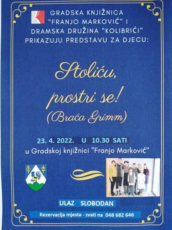 Gradska knjižnica “Franjo Marković” i Dramska družina “Kolibrići” pozivaju djecu na predstavu “Stoliću, prostri se!”, kojom obilježavaju Noć knjige i Dan grada. Priču Braće Grimm dramatizirala je voditeljica Kolibrića Sanja Marković, a mladi glumci će je odigrati u subotu 23. travnja u 10:30 sati u multimedijskoj dvorani Knjižnice. Ulazak na predstavu se ne naplaćuje, ali je zbog ograničenog broja mjesta važno da se karte preuzmu na vrijeme na glavnom pultu knjižnice.