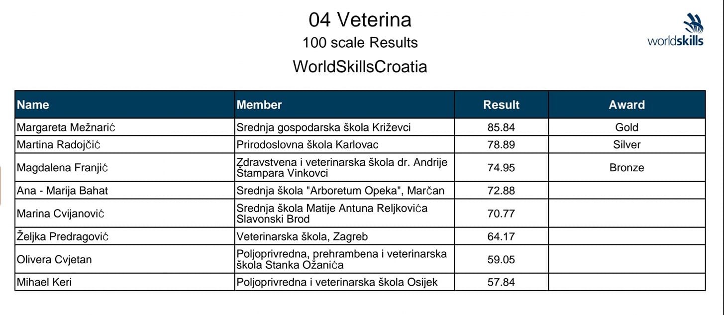 Na Državnom natjecanju učenika strukovnih škola – WorldSkills Croatia 2022., održanom od 10. do 12.svibnja 2022. godine u Zagrebu u području “Veterina” učenica Srednje gospodarske škole Margareta Mežnarić osvojila je 1. mjesto i postala državna prvakinja. Njezina mentorica nastavnica je Suzana Maranić Bošnjak!