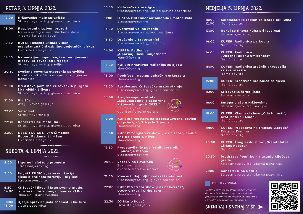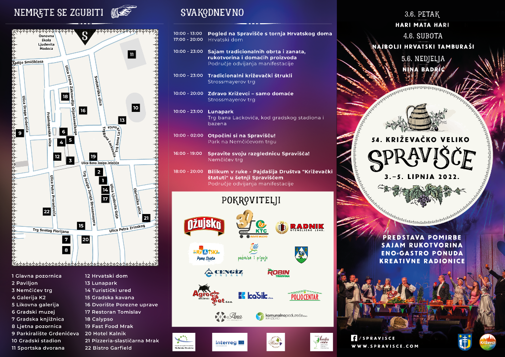 Najveća križevačka turistička manifestacija Križevačko veliko spravišče ove se godine vraća u stari termin – od 3. do 5. lipnja. Po 54. put na velikoj pozornici u centru grada, pomirit će se križevački purgeri i plemeniti kalnički šljivari pa ćes e nakon tri dana, kao i svaki put dosad, opet posvaditi. Nezaobilazan dio Spravišča su koncerti popularnih izvođača pa je za petak 3. lipnja najavljen Hari Mata Hari, u subotu 4. lipnja publiku će zabavljati Najbolji hrvatskih tamburaši, a u nedjelju Nina Badrić. “Posjetitelje očekuje bogata gastronomska ponuda kao i iznimno velika Štruklijada u kojoj sudjeluju mjesni odbori grada Križevaca. Posjetitelji će besplatno degustirati štrukle i glasati za najbolje“, najavljuju organizatori i dodaju da će se, osim štrukla, dijeliti i vol pripremljen na tradicionalan način. Najmlađe posjetitelje očekuju predstave, radionice i nastupi žonglera, a detaljan program je na stranici Spravišča.