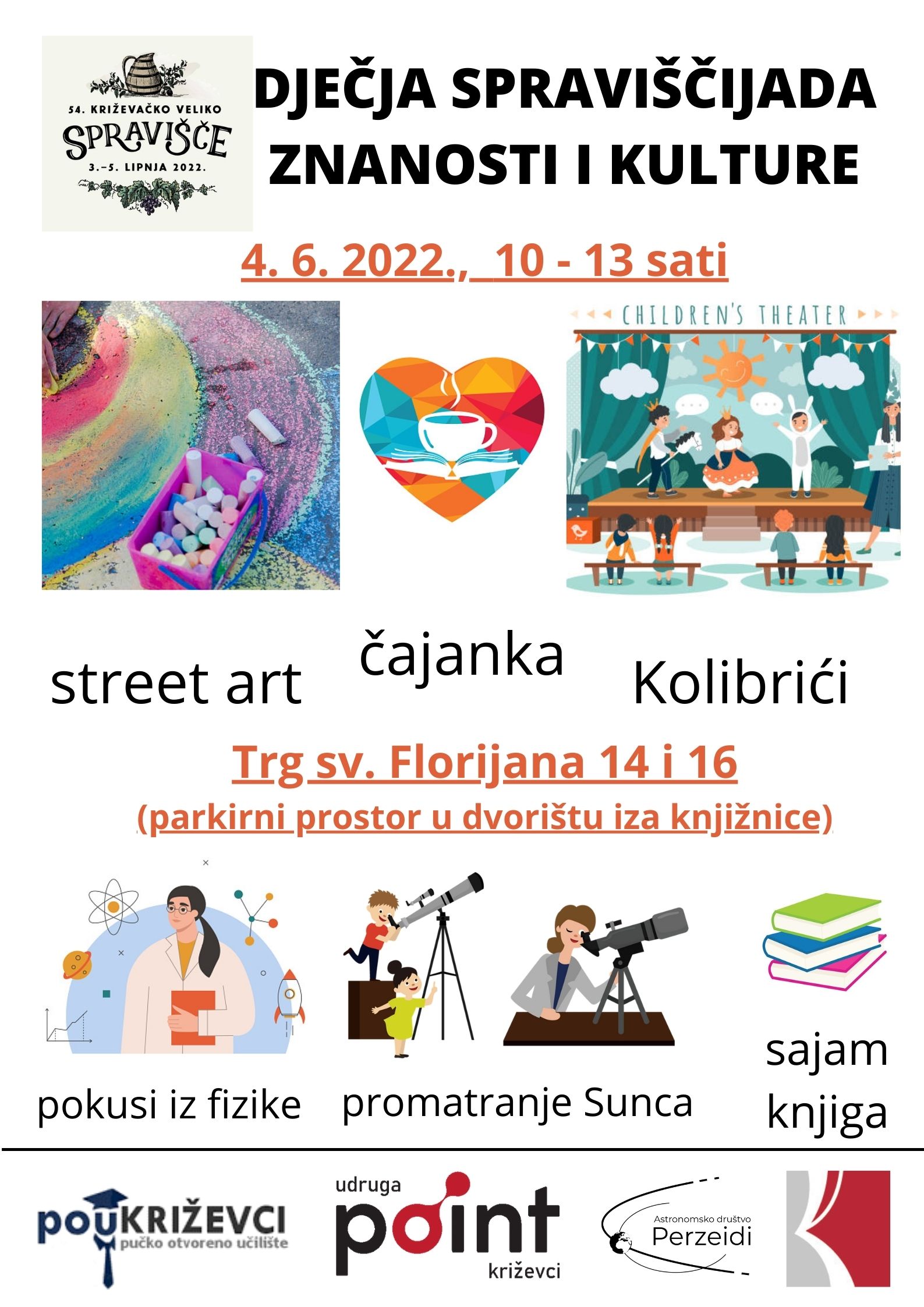 Spraviščijada uz puno zabave događat će se u subotu 4. lipnja na parkiralištu iza knjižnice, a sadržaji su namijenjeni djeci svih uzrasta. Od 10 do 11 sati tamo će dramska družina Kolibrići odigrati predstavu i nakon mnogo godina oživjeti pozornicu nekadašnjeg ljetnog kina. “Od 11 do 13 sati djeca mogu oslikavati parkiralište, poslušati priču na čajanci koja će se prvi put održati na otvorenom, mogu izvoditi pokuse iz fizike, promatrati Sunce te saznati sve što ih zanima o fizici i svemiru“, najavila je Maja Petračija iz Gradske knjižnice. Doznajemo da se sprema lansiranje rakete i spuštanje balona padobranom, no organizatori ne žele otkrivati detalje. Dok se klinci bave znanošću i umjetnošću, roditelji na istom mjestu mogu razgledati i kupiti knjige na sajmu knjiga.