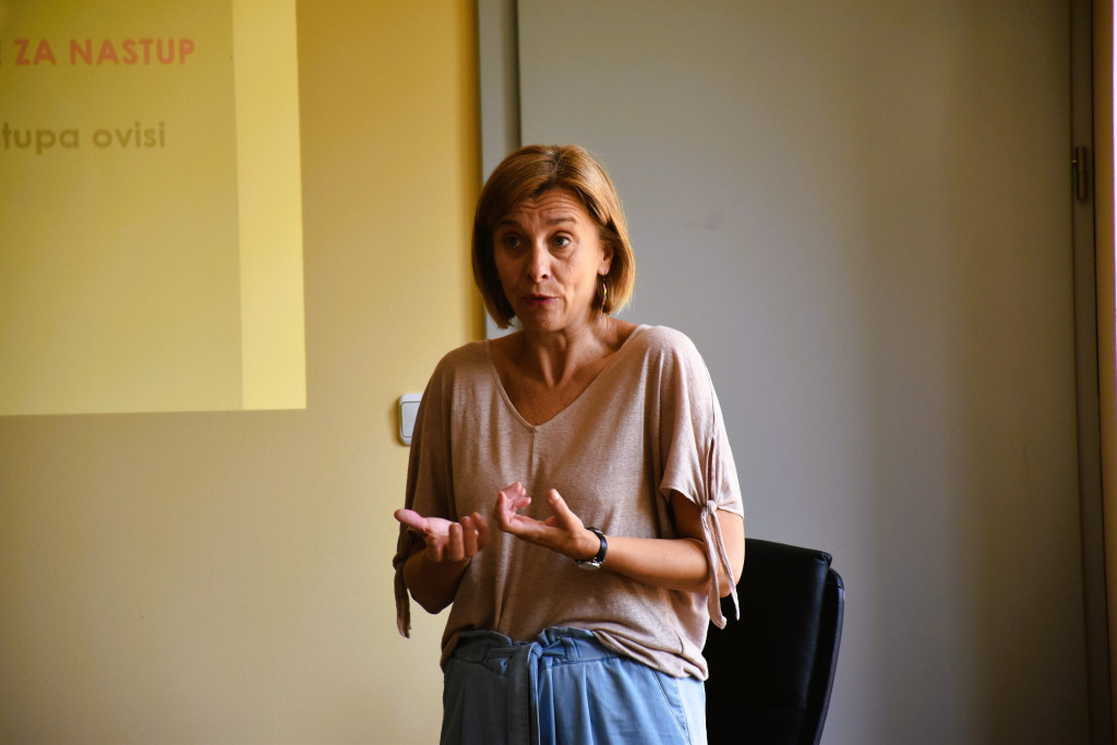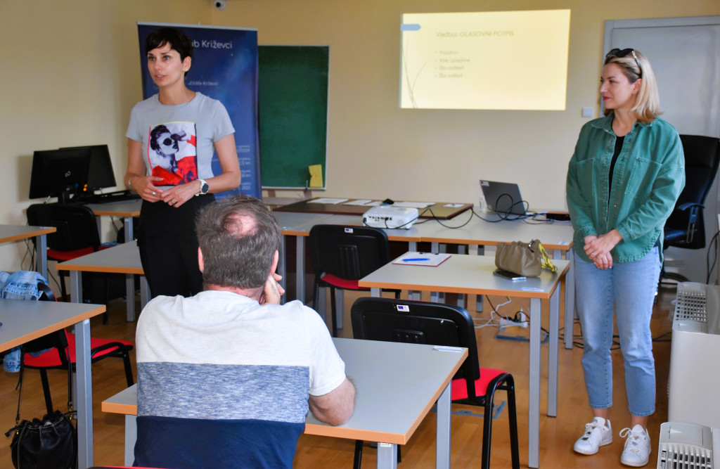Učiteljica glasa i govora, trenerica javnog i medijskog nastupa fonetičarka Anita Tripalo, učila ih je kako govoriti moćno, nemonotono a ne prebrzo, s pravom dozom strasti i prikladnim govorom tijela. Naučila ih je i kako se trebaju pripremiti za govor, ali i redovno trenirati glas i držanje. “Uspješnost njihovog nastupa ovisi o tome što su napravili prije i što rade tijekom nastupa – jesu li se pripremili, govore li prebrzo ili presporo, tiho ili preglasno, imaju li ruke u džepovima ili prijete olovkom kao dirigentskim štapićem. Slušačima se to najčešće ne sviđa“, objasnila je voditeljica radionice i polaznicima otkrila male trikove koji će im pomoći da prevladaju nalete prevelike treme i straha od nastupa te postanu samopouzdaniji i svjesniji svojih govorničkih i prezentacijskih vrlina.