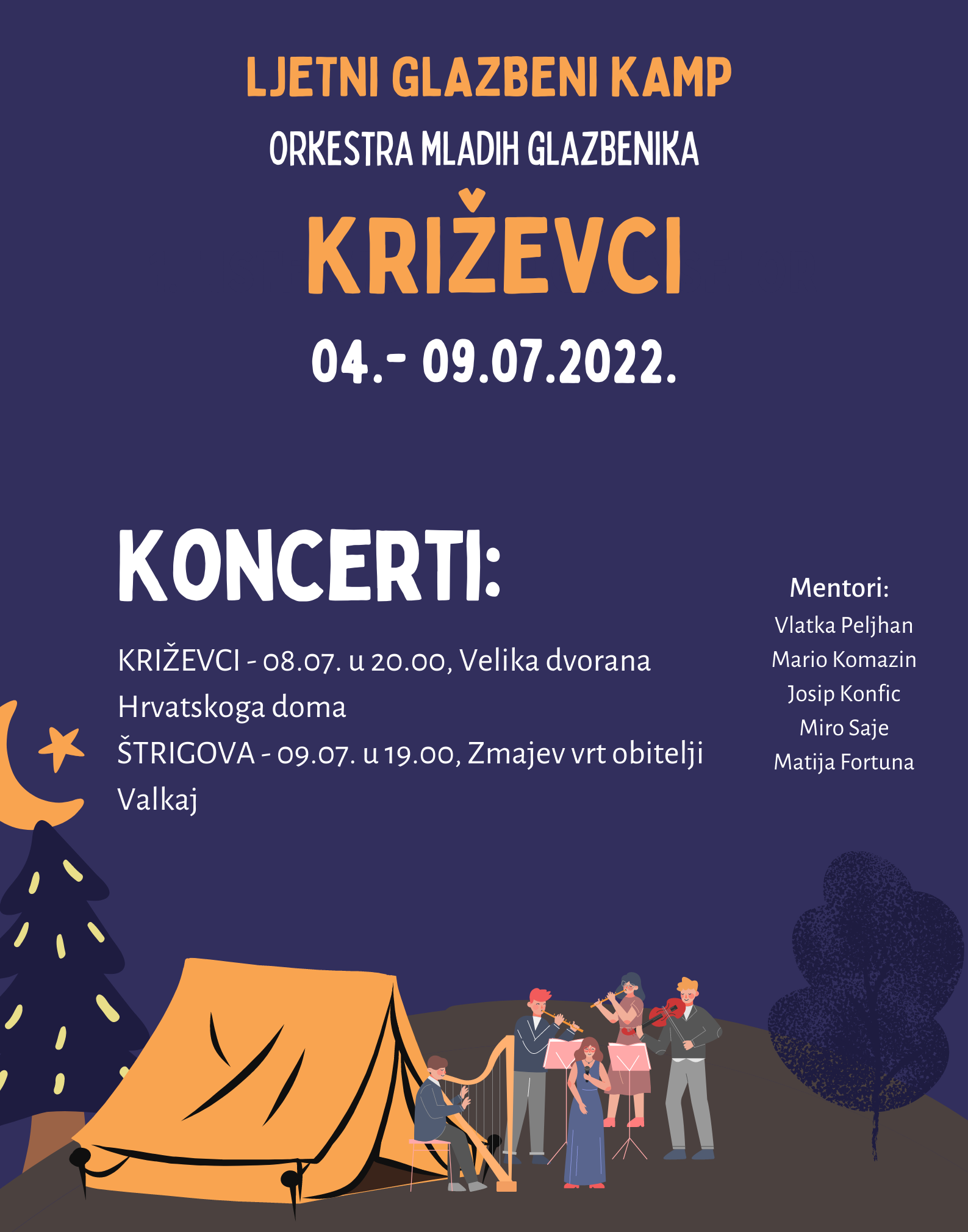 Od danas do 9. srpnja Križevci su domaćin prvom Ljetnom glazbenom kampu orkestra mladih glazbenika. Kamp je nastao na inicijativu članova Orkestra mladih glazbenika po uzoru na kampove koje mnogi glazbenici posjećuju diljem Europe kako bi usavršili svoje orkestralno muziciranje. Polaznici, njih 40-ak, imat će priliku pet dana intenzivno uvježbavati program za ostatak koncertne sezone te za najavljeno gostovanje Orkestra u Berlinu u rujnu 2022. godine. Radit će sa svojim mentorima, uvježbavati program na sekcijskim i zajedničkim probama s maestrom Matijom Fortunom i mentorima Križevčanima Josipom Konficom i Mariom Komazinom, violinisticom Vlatkom Peljhan i slovenskim maestrom Mirom Sajom.