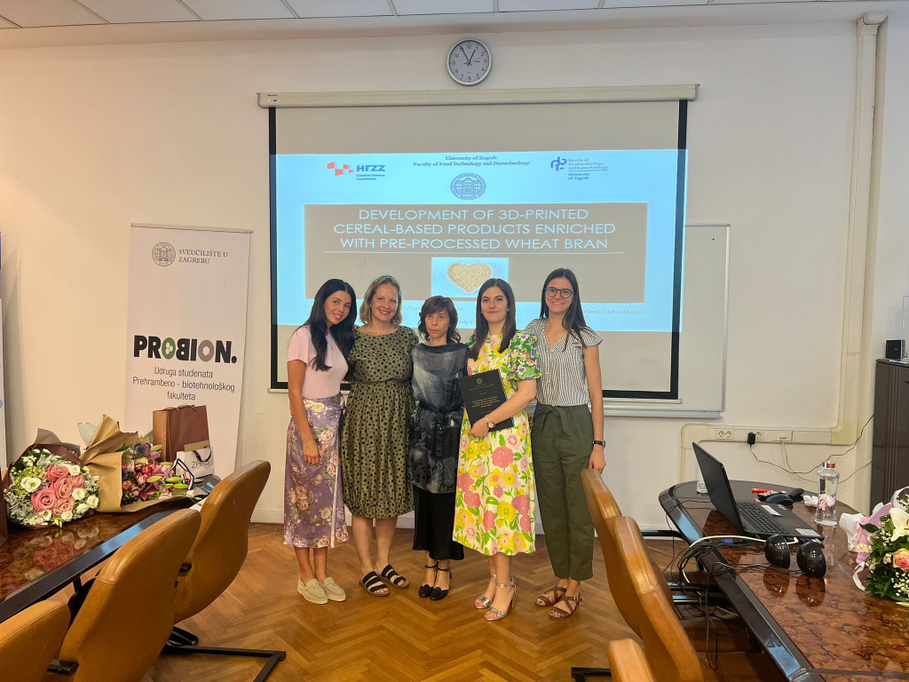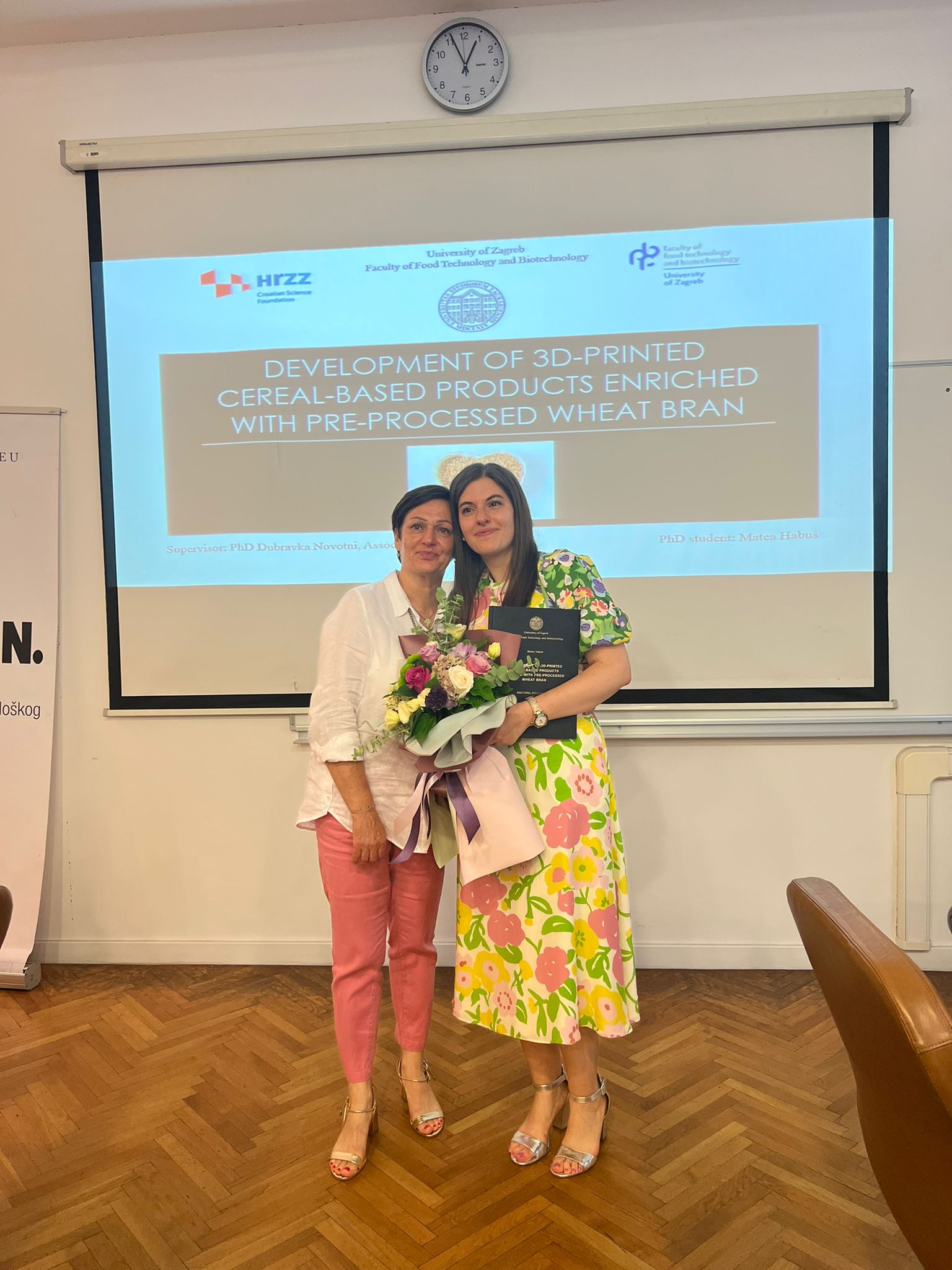 Na Prehrambeno-biotehnološkom fakultetu Sveučilišta u Zagrebu u utorak, 26. srpnja 2022. godine doktorsku disertaciju je obranila Križevčanka Matea Habuš, mag. ing., na temu „Razvoj trodimenzijski tiskanih proizvoda od žitarica obogaćenih obrađenim pšeničnim posijama” (Development of 3D-printed cereal-based products enriched with pre-processed wheat bran). Dr. sc. Habuš je na doktoratu radila pod mentorstvom izv. prof. dr. sc. Dubravke Novotni iz Laboratorija za kemiju i tehnologiju žitarica pri Zavodu za prehrambeno-tehnološko inženjerstvo.