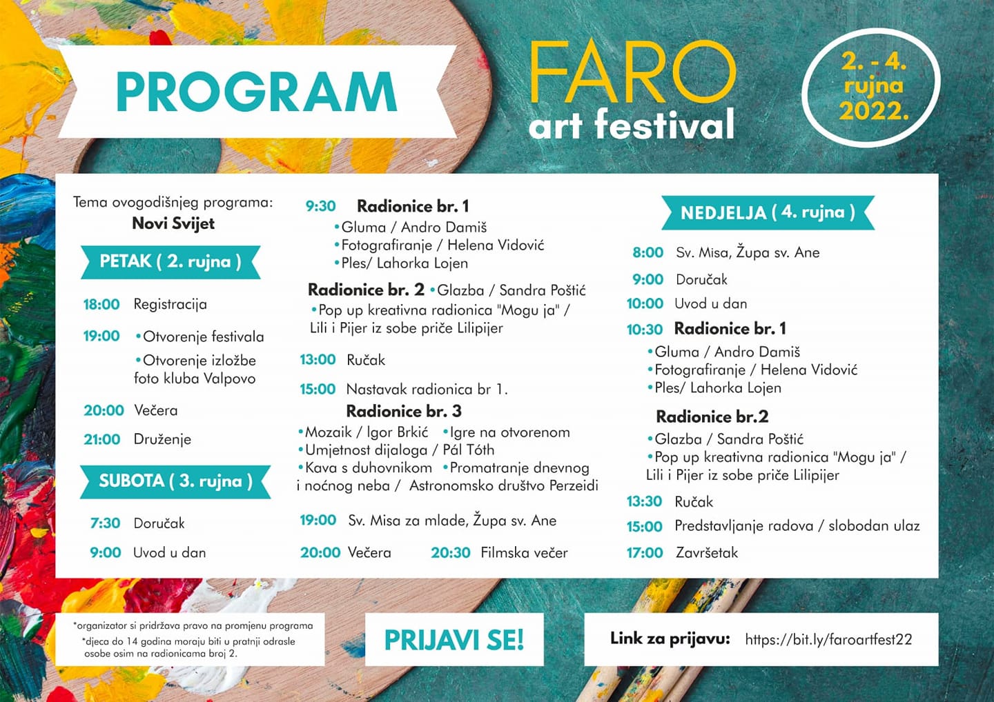 Organizatori najavljuju brojne umjetničko-kreativne radionice koje će voditi domaći i gostujući umjetnici, a prijave su obvezne putem online prijavnice. Neće nedostajati večernjih druženja, a za subotu, 3. rujna najavljena je i filmska večer. Na kraju festivala u nedjelju sudionici će zajednički predstaviti svoje kreativne radove.