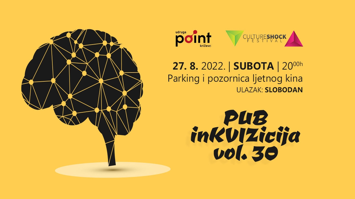 “Sigurno vam je dosta ljetnih partyja, sunca, mora, plaže i turističke gnjavaže? Ako je odgovor potvrdan pa i ako nije, zreli ste za bonus program, i to u Križevcima. Prvi put otkad je svijeta i vijeka Pub inKVIZicija ide open-air. Popularna igra dovrtjela se do 30. izdanja i za veliki jubilej uprizoruje se pod zvijezdama”, najavljuju organizatori iz udruge P.O.I.N.T..