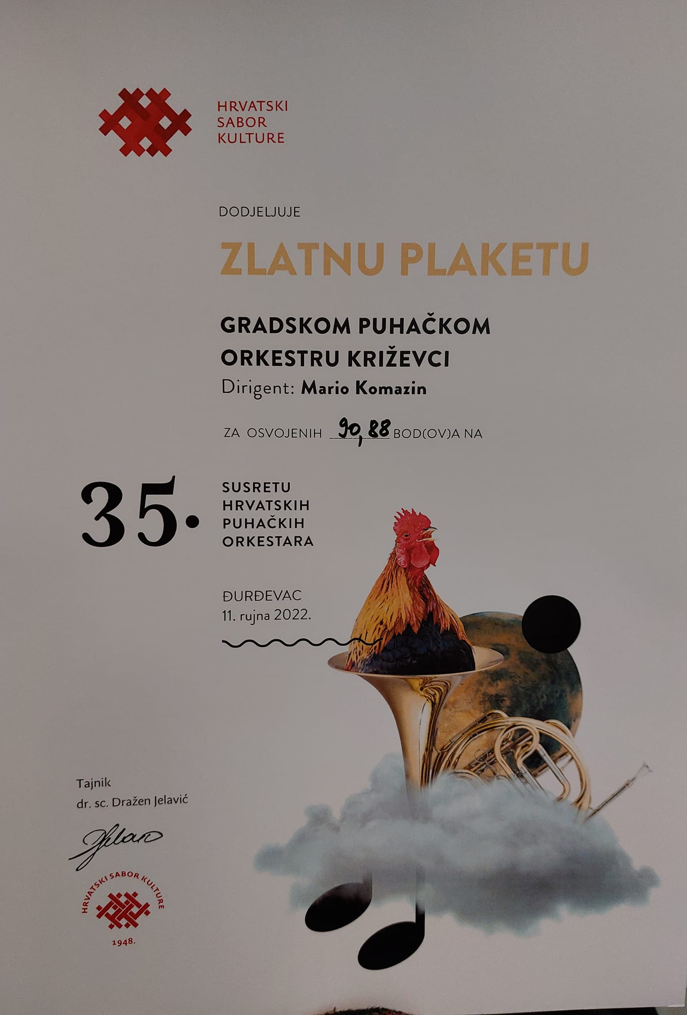 Na 35. Susretu hrvatskih puhačkih orkestara, koji je u nedjelju, 11. rujna 2022. godine u Đurđevcu okupio 12 najuspješnijih puhačkih orkestara iz devet hrvatskih županija s više od 420 glazbenika, Gradski puhački orkestar Križevci s dirigentom Marijom Komazinom osvojio je zlatnu plaketu s 90.88 bodova. Time je križevački orkestar potvrdio svoje mjesto među najboljim puhačkim orkestrima u Hrvatskoj.