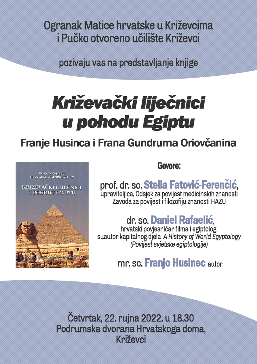 Ogranak Matice hrvatske u Križevcima i Pučko otvoreno učilište Križevci pozivaju u četvrtak, 22. rujna 2022. u 18.30 sati u Malu (podrumsku) dvoranu Hrvatskoga doma na predstavljanje knjige „Križevački liječnici u pohodu Egiptu” Franje Husinca i Frana Gundruma Oriovčanina.
