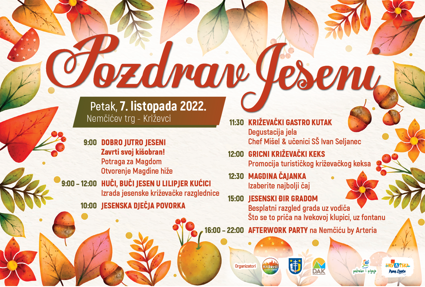 Sve je spremno za sutrašnji sajam Pozdrav jeseni koji već nekoliko godina organiziraju Grad Križevci i Turistička zajednica grada Križevaca kojoj se ove godine pridružila i Destinacijska agencija Križevci. Zamislili su brojna događanja na Nemčićevom trgu od 9 ujutro pa sve do večeri – kreativci će izlagati svoje radove, otvorit će se Magdina hiža i degustirati ukusna jela koja će pripremiti učenici Srednje škole Ivan Seljanec sa svojim nastavnikom Mišelom Doskočilom. Posjetitelji će birati najbolji čaj, a organizatori će predstaviti tzv. “turistički križevački keks”.