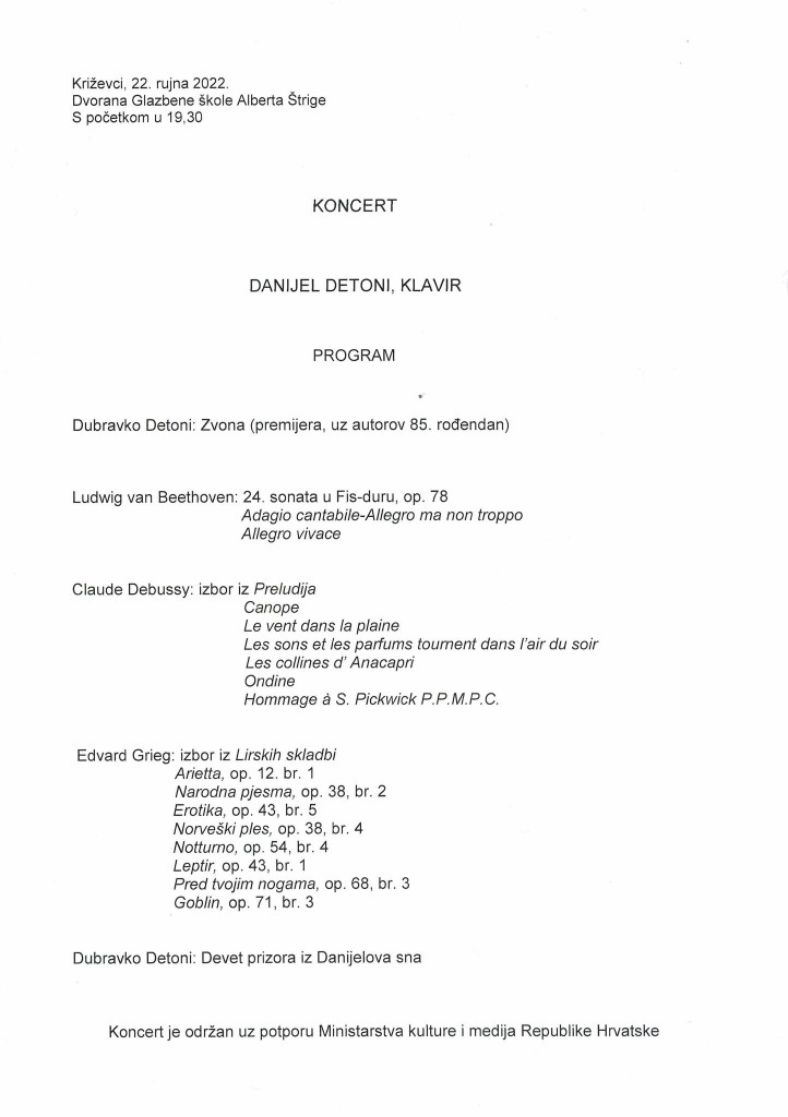 U Koncertnoj dvorani Glazbene škole Alberta Štrige u Križevcima je 22. rujna 2022. održan koncert koji se pamti. Danijel Detoni nam je odsvirao puno skladbi različitog sadržaja. Skladbe su bile dočarane tonovima koji su izlazili iz klavira. Bile su i dramatične, lijepe, brze, sporije. Najviše mi se sviđala skladba Beethovena, 24. sonata u Fis duru, op. 78. koja je bila puna različitih dinamika i karaktera.