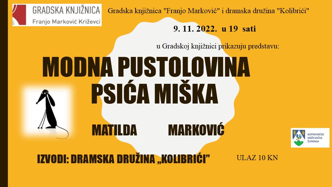 Dramska družina “Kolibrići” pripremila je novu predstavu Modna pustolovina psića Miška koju će premijerno odigrati u u srijedu, 9. studenoga s početkom u 19:15 sati u multimedijskoj dvorani knjižnice. Kolibrići su sa svojom voditeljicom Sanjom Marković uvježbali predstavu prema tekstu Matilde Marković koji su sami adaptirali. Njihov rad podupire Ministarstvo kulture i medija, Grad Križevci i Koprivničko-križevačka županija.