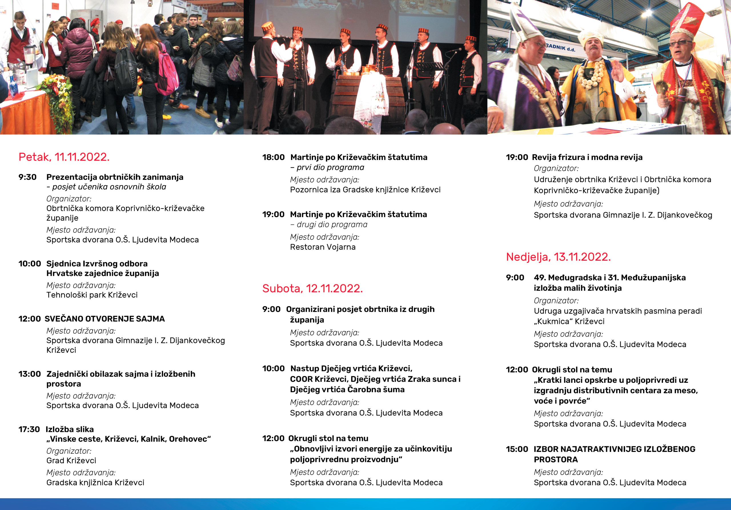 “Kroz tri dana trajanja manifestacije pruža se sjajna prilika za upoznavanje županijskog gospodarstva, kao i za predstavljanje mogućnosti ulaganja na području županije“, poručuje organizator sajma Koprivničko-križevačka županija. Suorganizatori su Grad Križevci, Hrvatska gospodarska komora Županijska komora Koprivnica, Obrtnička komora Koprivničko-križevačke županije, Udruženje obrtnika Križevci, PORA Regionalna razvojna agencija Koprivničko-križevačke županije, Turistička zajednica Grada Križevaca i Turistička zajednica Koprivničko-križevačke županije. Sajam se održava u sportskoj dvorani OŠ Ljudevita Modeca u Potočkoj ulici i otvoren je od 9 do 19.