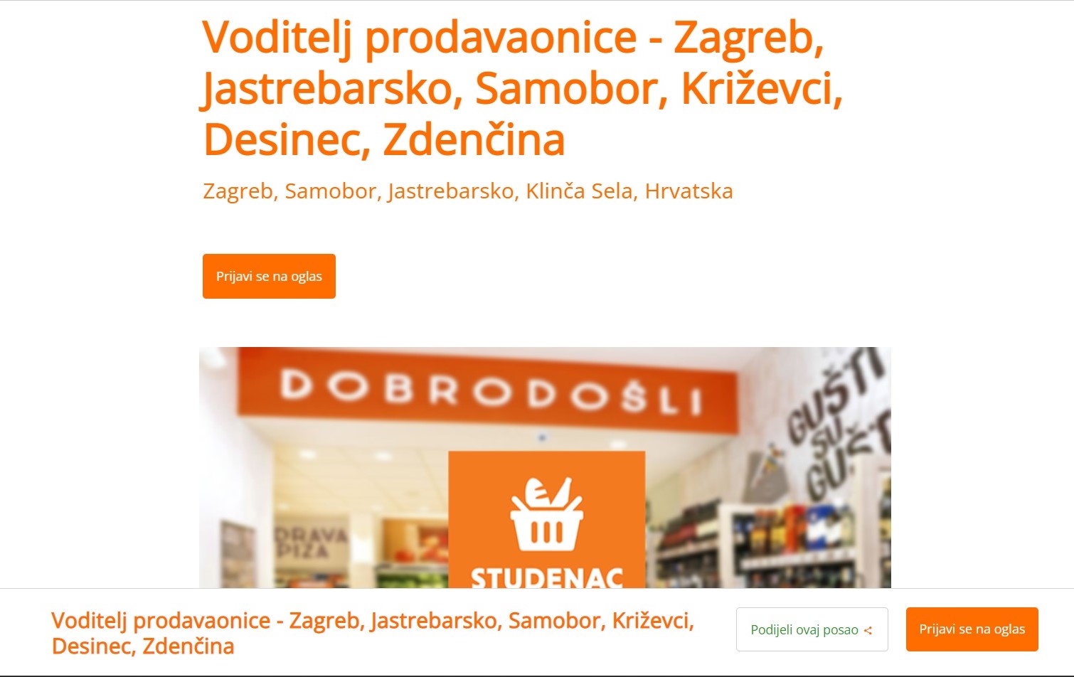 Trgovački maloprodajni lanac Studenac traži zaposlenika za trgovinu u Križevcima i to na radno mjesto “voditelj prodavaonice”, a rok za prijave ističe danas. Za mjesto budućeg voditelja prodavaonice dovoljna je srednja stručna sprema, jednogodišnje iskustvo na rukovodećim pozicijama i osnovno poznavanje rada na računalu. Budući da je u opisu posla navedeno da će voditelj upravljati manjim timom zaposlenika, za očekivati je da će Studenac zaposliti još radnika u Križevcima.