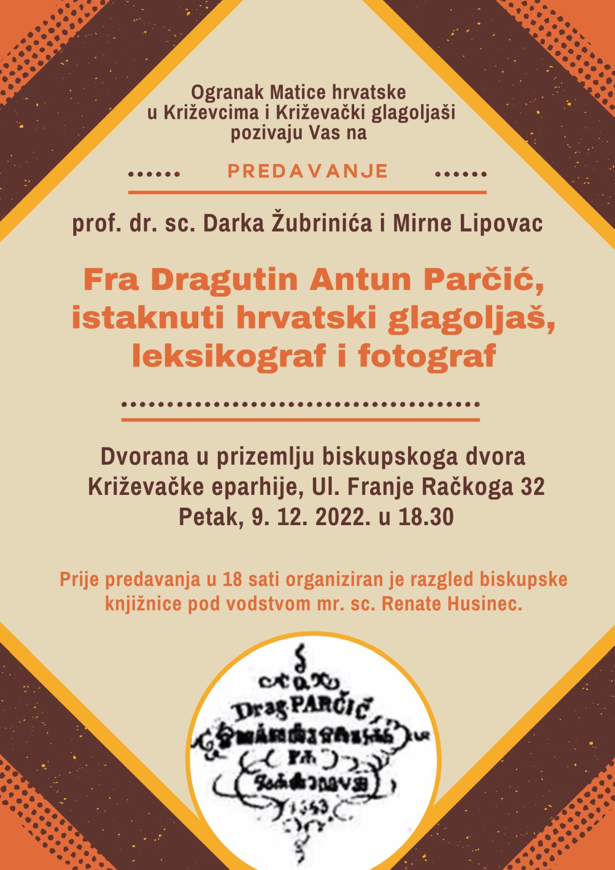Ogranak Matice hrvatske u Križevcima i Križevački glagoljaši pozivaju na predavanje prof. dr. sc. Darka Žubrinića i Mirne Lipovac na temu “Fra Dragutin Antun Parčić, istaknuti hrvatski glagoljaš, leksikograf i fotograf”, koje će se održati večeras u 18:30 sati u dvorani u prizemlju biskupskoga dvora Križevačke eparhije na adresi Ulica Franje Račkoga 32.