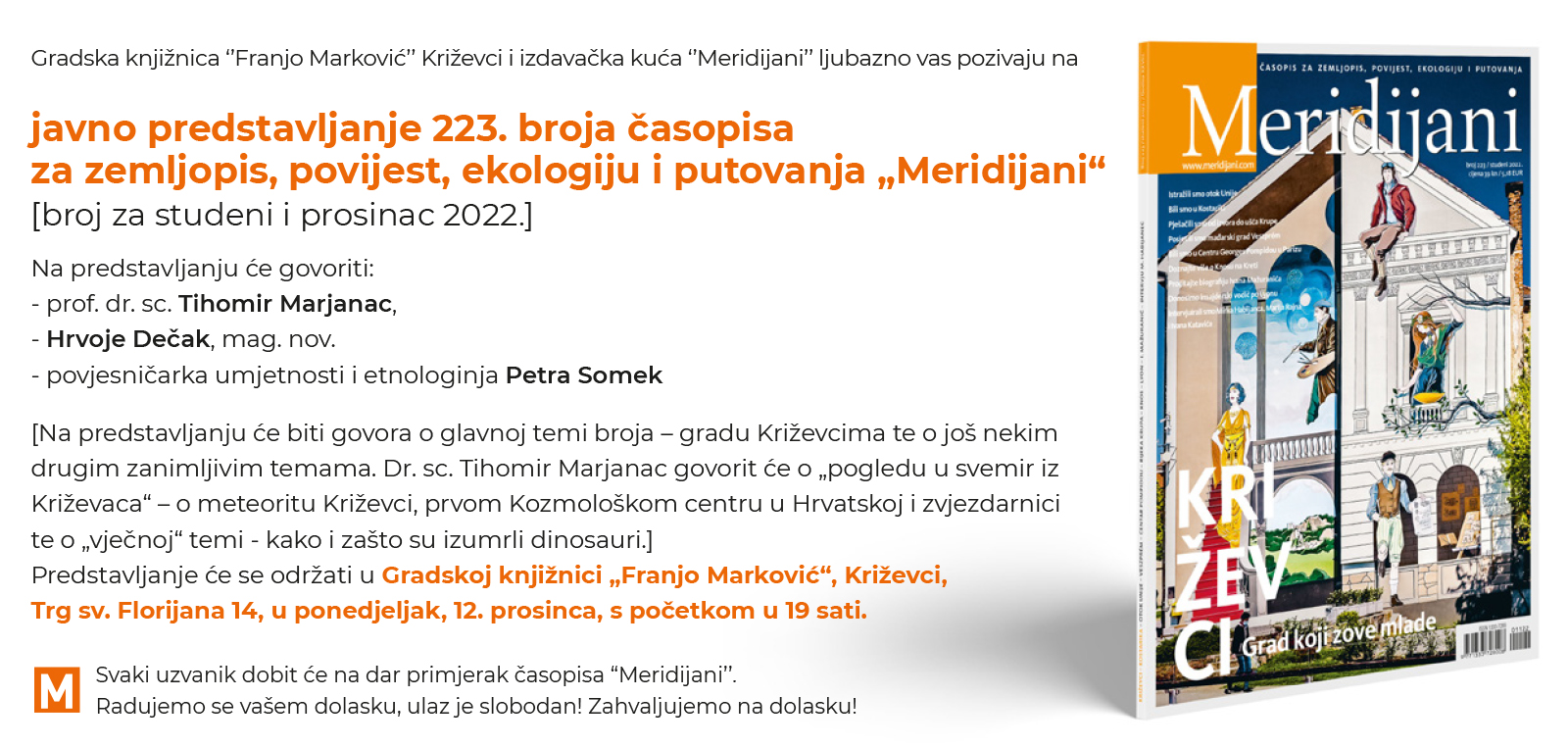Gradska knjižnica “Franjo Marković” Križevci i izdavačka kuća “Meridijani” pozivaju na javno predstavljanje 223. broja časopisa za zemljopis, povijest, ekologiju i putovanja Meridijani, koje će se održati u ponedjeljak 12. prosinca u 19 sati u multimedijskoj dvorani knjižnice. Publika će dobiti na poklon jedan od starijih brojeva Meridijana, a ovaj najnoviji broj će moći kupiti.