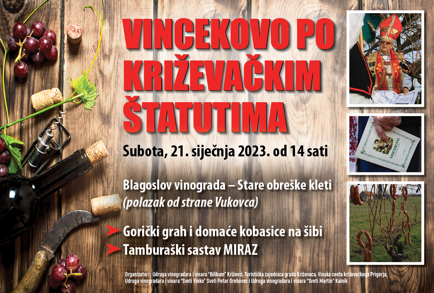 A kakva bi to svetkovina bila bez jela i pila – bačve su još pune pa vina ne bi trebalo manjkati, a od “ozbiljnije” hrane organizatori najavljuju gorički grah i kobasice na šibi. Za muziku će se pobrinuti tamburaški sastav Miraz. Vincekovo po Križevačkim štatutima organiziraju Udruge vinogradara i vinara “Bilikum” iz Križevaca, “Sveti Vinko” iz Sv. Petra Orehovca i “Sveti Martin” iz Kalnika, Turistička zajednica grada Križevaca i Vinska cesta Križevačkoga prigorja.