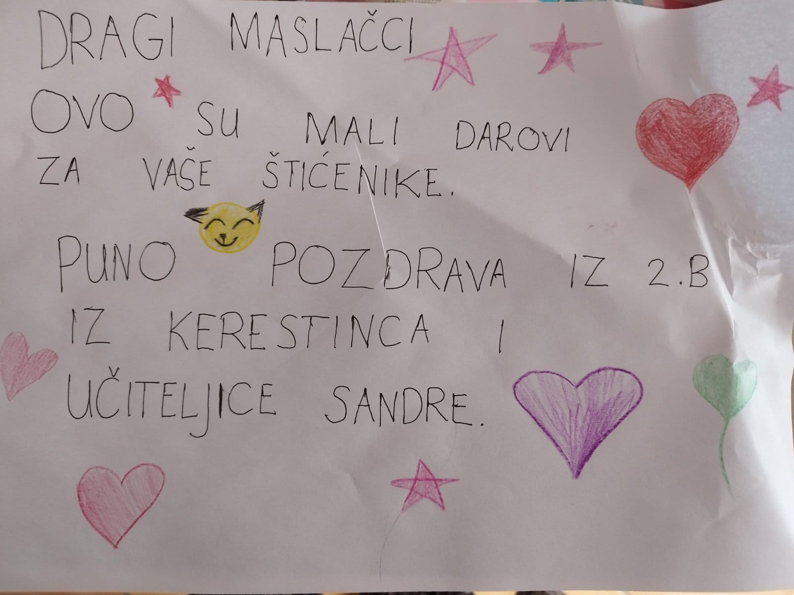 Donaciju su im pripremili i poslali učenici 2.b razreda s učiteljicom Sandrom Vuk, inače počasnom članicom križevačke udruge P.O.I.N.T. koja je u razdoblju od 2004. do 2013. godine redovito prikupljala donacije za osobe s intelektualnim teškoćama Križevaca u sklopu ondašnje humanitarne akcije „Petaka za đaka/FIVE4KIDS“.