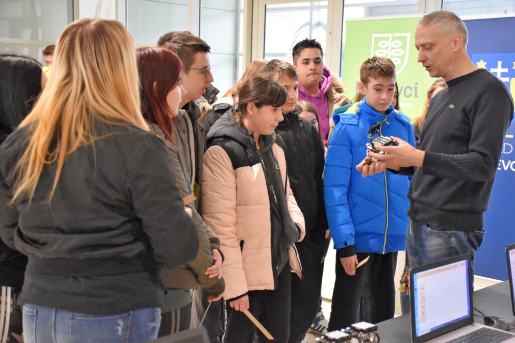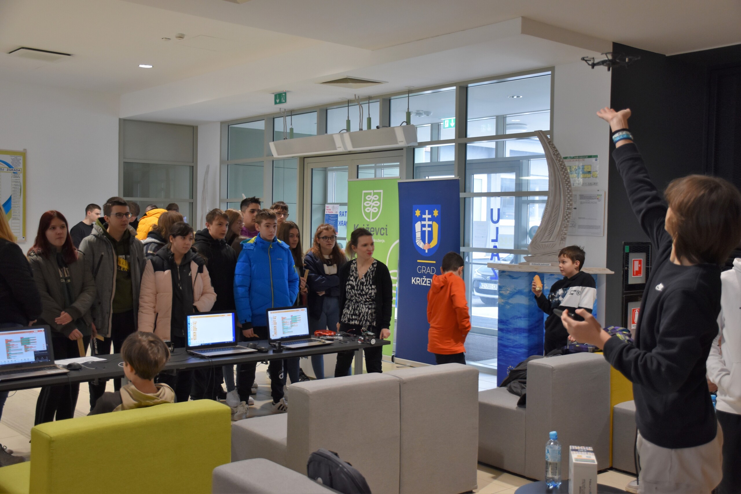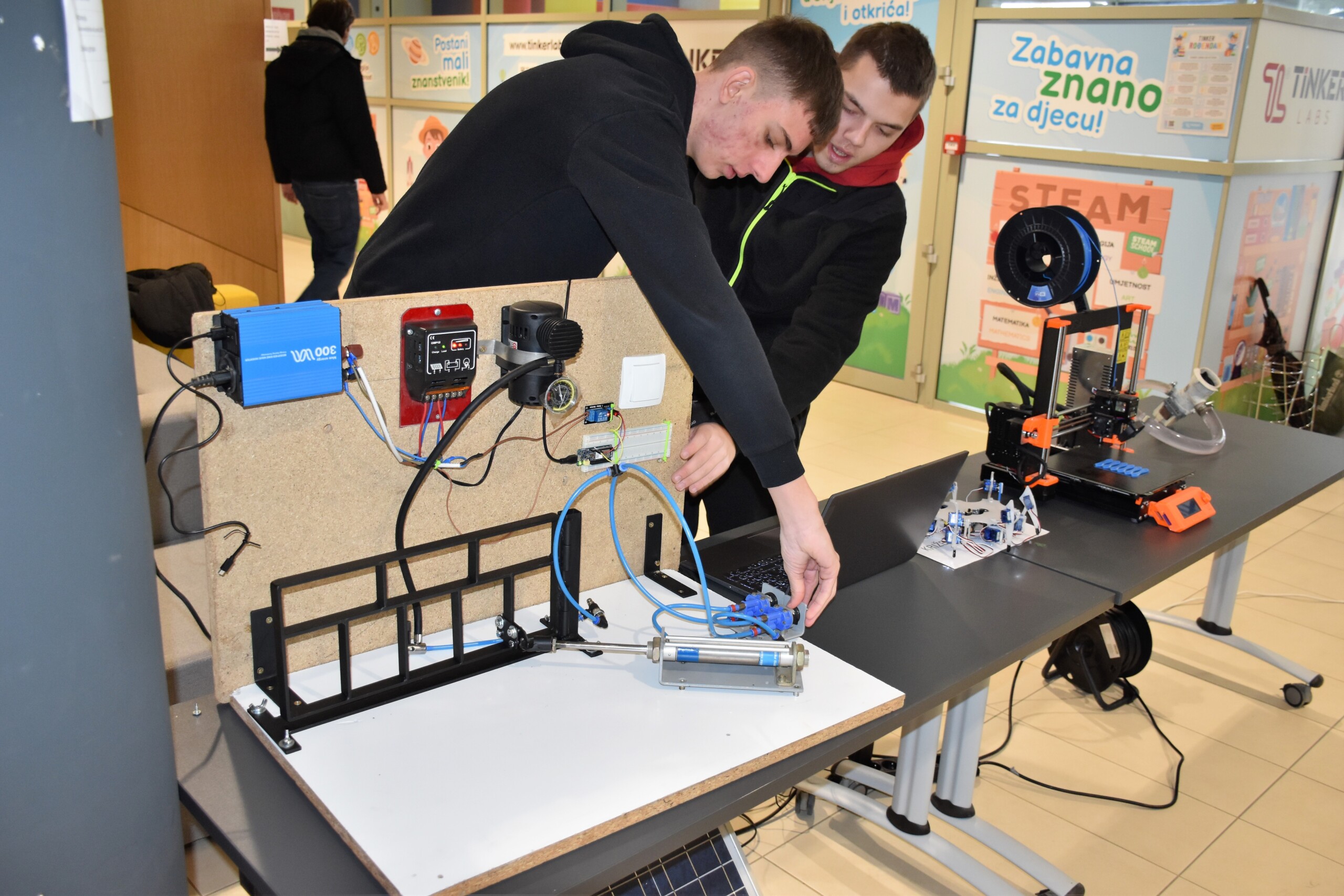 Učenici strojarskog usmjerenja Srednje škole “Ivan Seljanec” predstavili su vrata na pneumatski pogon s daljinskim upravljanjem, osnovnoškolci iz “Vladimira Nazora” pokazali su svoje projekte s micro:bitom, električno vozilo i robote s umjetnom inteligencijom, maturanti iz Gimnazije Ivana Zakmardija Dijankovečkog pokazali su kako pomoću Kundtove cijevi možemo vidjeti zvučne valove. Učenici iz OŠ “Vladimir Nazor” koji su na izložbu došli u pratnji svoje učiteljice Sonje Dominković, sa zanimanjem su pratili i predavanje udruge P.O.I.N.T. u kojem su naučili kakve veze imaju glazba i fizika – pomoću Rubenove cijevi kroz kombinaciju vatre i glazbe vidjeli su kako izgledaju zvučni valovi nekih pjesama te kako se, ovisno o frekvenciji zvuka, mijenja plamen. Najviše im se svidio Mozart.