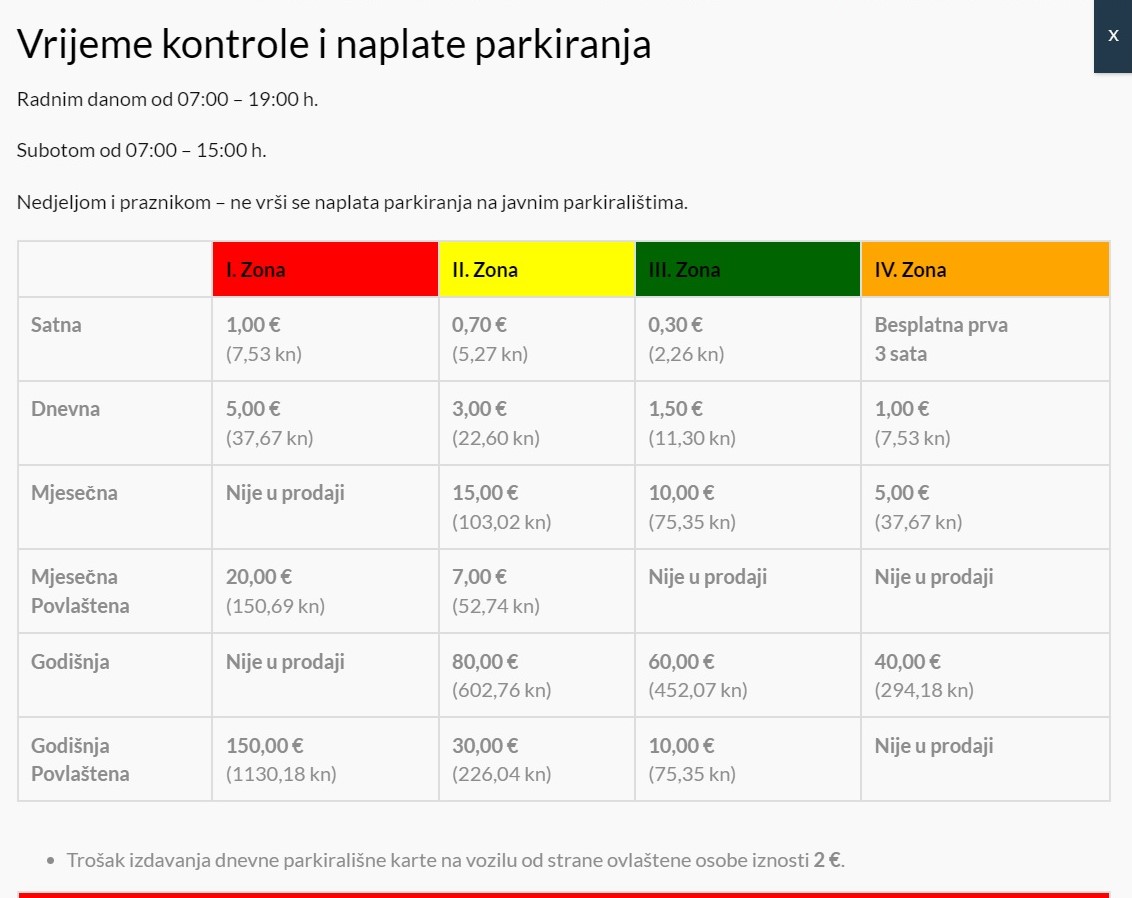 Od ponedjeljka 6. ožujka parkiranje u Križevcima će se naplaćivati, obavijestio je to danas gradonačelnikov ured priopćenjem. Naplaćivat će se radnim danom od 7 do 19 sati i subotom od 7 do 15, nedjeljom i praznikom je besplatno. Cijena satne karte u I. zoni je 1 euro, u II. zoni 0,7 eura i u III. zoni 0,3 eura. Što se tiče IV. zone, odnosno parkirališta na Trgu bana Lackovića i u Grdenićevoj ulici, prva tri sata se neće naplaćivati, no za parkiranje nakon toga plaća se dnevna karta za jedan euro uvećana za još dva eura ako je izdaje ovlaštena osoba.