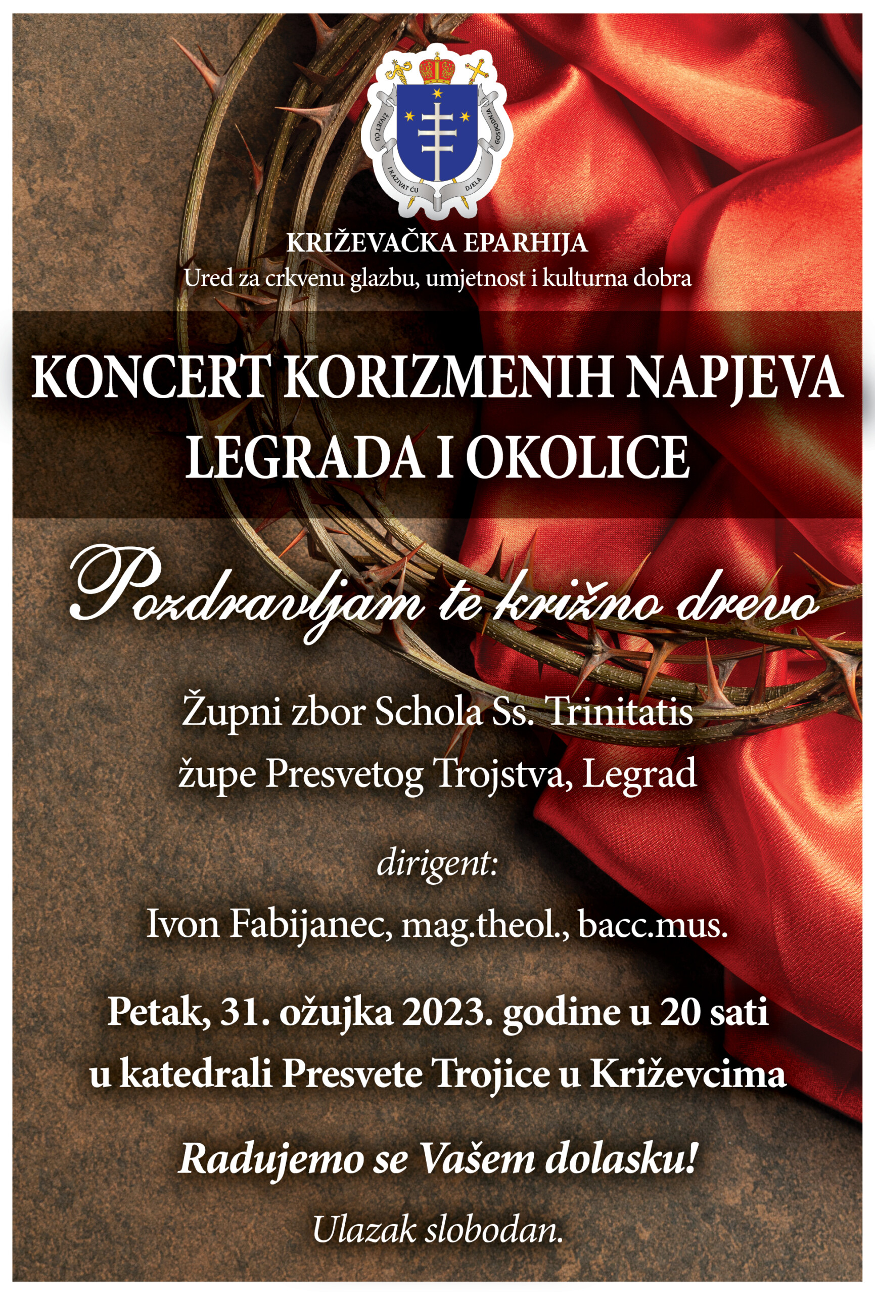 Križevačka eparhija i Ured za crkvenu glazbu, umjetnost i kulturna dobra pozivaju na koncert pasionske baštine korizmenih napjeva Legrada i okolice pod nazivom “Pozdravljam te križno drevo”. Nastupa Župni zbor Schola Ss. Trinitatis župe Presvetog Trojstva iz Legrada kojim će ravnati Ivon Fabijanec. Zbor je nedavno nastupio u zagrebačkoj crkvi svetog Vinka Paulskog u sklopu 32. svečanosti Pasionske baštine.