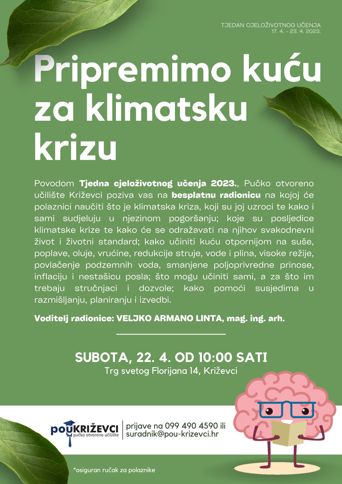 Pripremimo kuću za klimatsku krizu – naziv je radionice koju organizira Pučko otvoreno učilište Križevci u sklopu Tjedna cjeloživotnog učenja koje se po sedamnaesti put u Hrvatskoj održava od 17. do 23. travnja. Ova nacionalna obrazovna kampanja organizira se s ciljem podizanja svijesti o važnosti učenja i obrazovanja i svake se godine organiziraju brojne aktivnosti – predavanja, radionice, okrugli stolovi, koncerti i slično. Namjera je ne samo potaknuti na učenje, već osvijestiti da učenje nije samo formalno školovanje namijenjeno za mlade, već se učiti može kroz razne neformalne oblike, u bilo kojoj životnoj dobi.