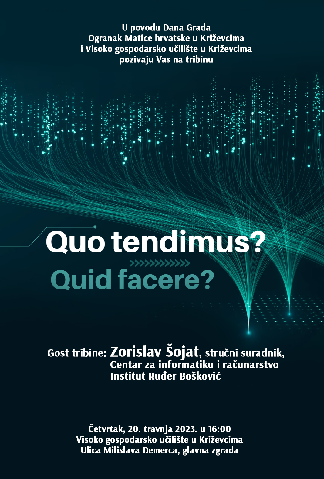 U povodu Dana grada Ogranak Matice hrvatske u Križevcima i Visoko gospodarsko učilište pozivaju na tribinu “Kamo idemo? Što uraditi”. Gost tribine bit će Zorislav Šojat, stručni suradnik Centra za informatiku i računarstvo na Institutu “Ruđer Bošković”, inače profesor lingvistike kojem su trenutačni znanstveni interesi kompjutorsko jezikoslovlje i filozofija kompjutoristike.