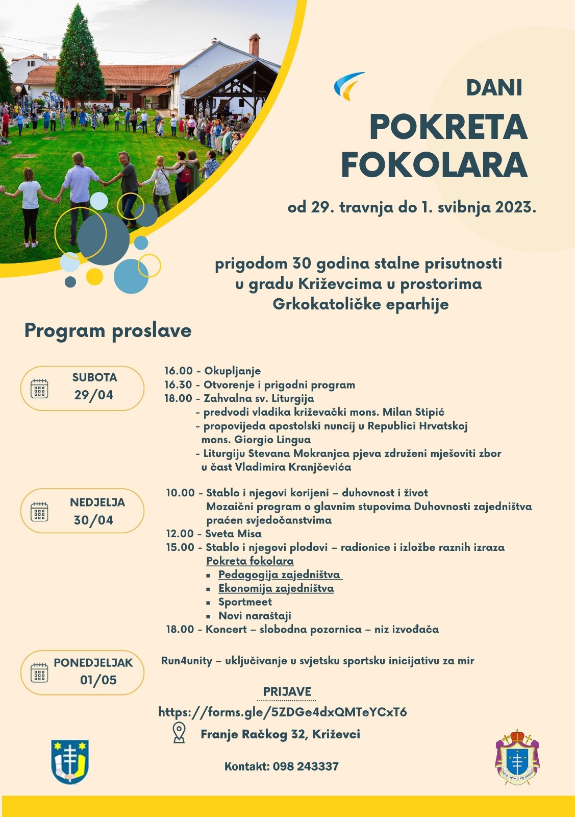 Od subote 29. travnja do ponedjeljka 1. svibnja u središtu Mariapoli Faro u Križevcima, Franje Račkoga 32, obilježit će se 30 godina stalne prisutnosti Pokreta fokolara u gradu Križevcima, u prostorima Centra Faro i Grkokatoličke eparhije.