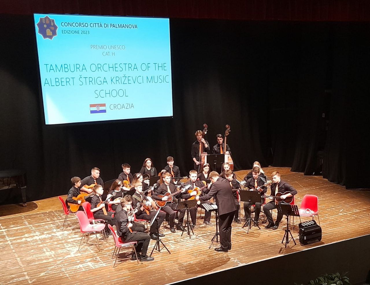 Tamburaški orkestar Glazbene škole Alberta Štrige osvojio je danas nagradu UNESCO-a kao najbolje ocijenjeni orkestar na međunarodnom natjecanju mladih glazbenika 11. Concorso musicale internazionale u Palmanovi u Italiji. U konkurenciji petnaest orkestara, četiri zbora, četrdeset osam komornih sastava i 291 solista, uz 1100 mladih glazbenika iz dvadeset zemalja, Križevčani su, pod ravnanjem Igora Kudeljnjaka osvojili 99 od mogućih 100 bodova! Iako su vrijedno vježbali program za natjecanje i bili sigurni da su dali sve od sebe, nagrada ih je iznenadila pa su nakon proglašenja priredili koncert na otvorenom i zasvirali na gradskom trgu u Palmanovi.