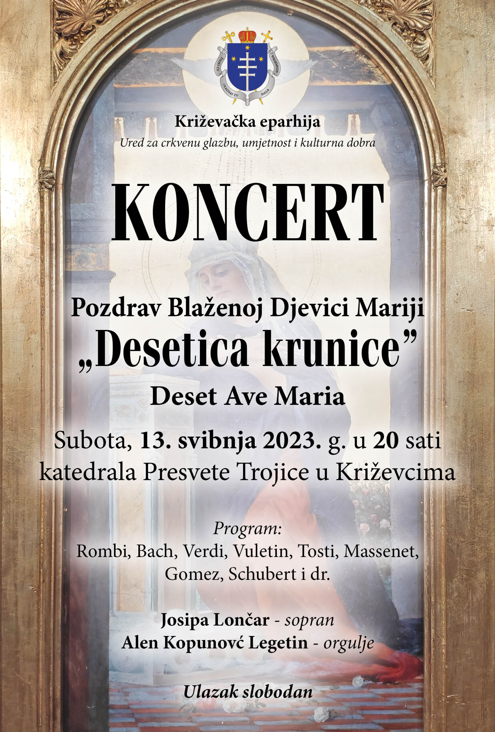 Još jedan koncert klasične glazbe održat će se večeras u 20 sati u katedrali Presvete Trojice u Križevcima. Križevačka eparhija i Ured za crkvenu glazbu, umjetnost i kulturna dobra pozivaju na koncert “Pozdrav Blaženoj Djevici Mariji – Deset Ave Maria” koji će izvesti sopranistica Josipa Lončar i orguljaš Alen Kopunović Legetin. Na programu su djela Verdija, Bacha, Schuberta i drugih skladatelja.