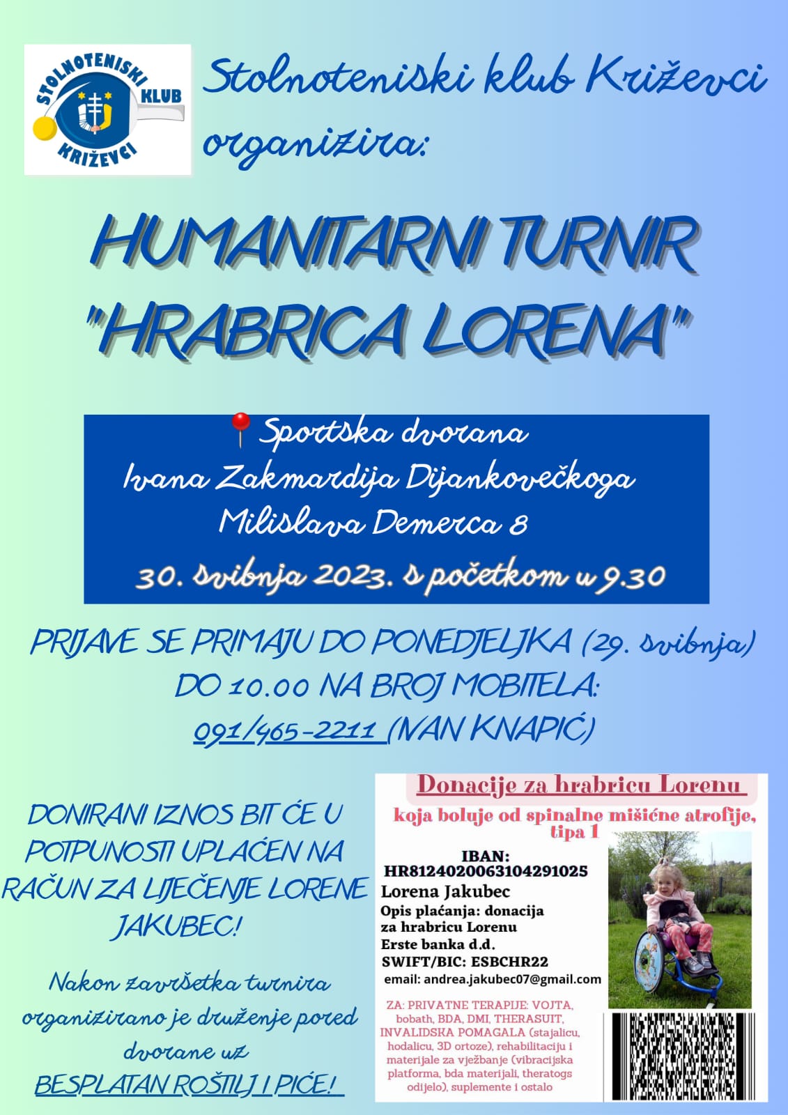 Stolnoteniski klub Križevci poziva građane da se pridruže humanitarnom turniru kojeg organiziraju 30. svibnja kako bi prikupili novac za terapiju za djevojčicu Lorenu Jakubecu. Igrat će se od 9:30 u dvorani Gimnazije Ivana Zakmardija Dijankovečkoga, a svi sudionici igrat će u zajedničkoj kategoriji i dobnih granica nema.