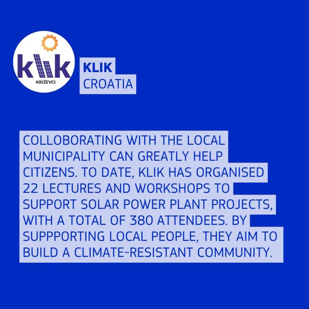 Na danas u Bruxellesu održanoj svečanosti dodjele Europske nagrade za održivu energiju – EUSEW (European Sustainable Energy Awards) 2023, energetska zadruga KLIK – Križevački laboratorij inovacija za klimu, proglašena je pobjednikom glasovima javnosti u kategoriji lokalnih energetskih akcija. KLIK je nagrađen za izniman trud u transformaciji lokalne zajednice kroz održiva energetska rješenja, u pomaganju Križevčanima u razvoju klimatskih i energetskih projekata te poticanju na ulaganja u obnovljive izvore energije.