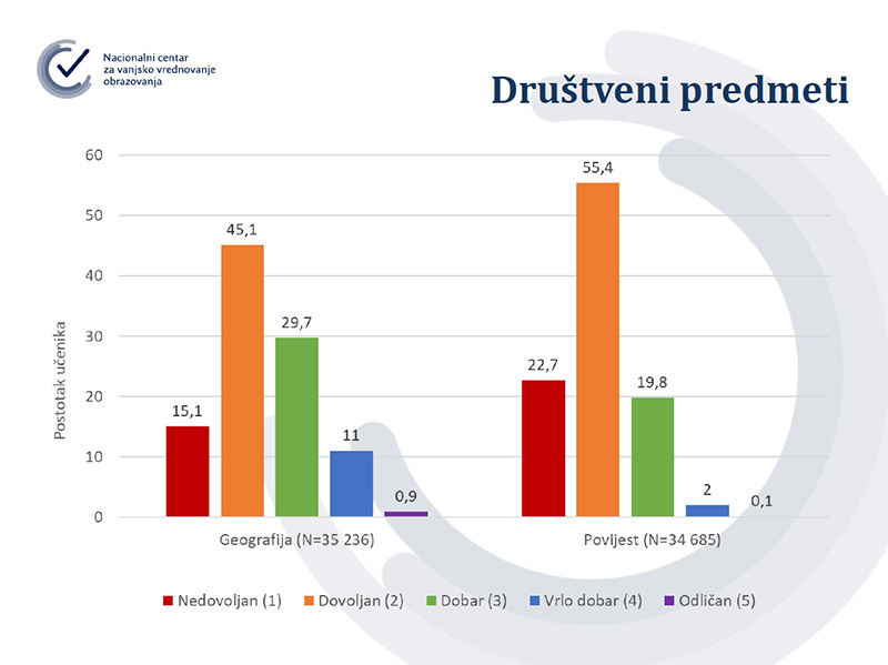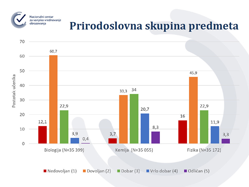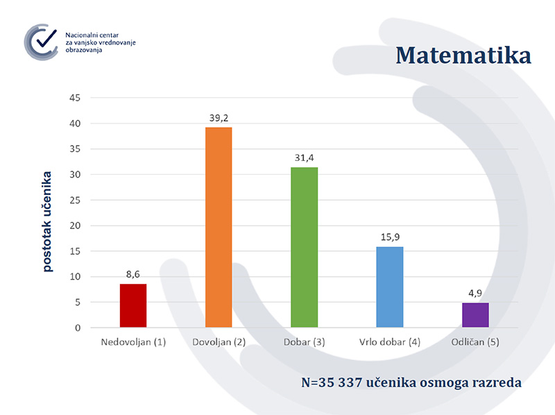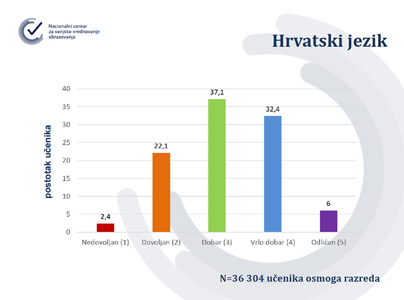Učenici osmih razreda od prošlog tjedna u e-Dnevniku mogu vidjeti kako su riješili nacionalne ispite i to postotak, ostvareni broj bodova i maksimalni broj bodova za svaki od osam predmeta koji su pisali – Hrvatskog, prvog stranog jezika, Matematike, Biologije, Kemije, Fizike, Geografije i Povijesti. Rezultat je učenicima prikazan u ocjenama, no te ocjene neće se vrednovati za upis u srednje škole. Za dvojku su trebali imati 20 posto točnih odgovora, za trojku 40 posto, za četvorku 60 posto, a za peticu 80 posto. Rezultati su dostupni i predmetnim nastavnicima u e-Dnevniku i u posebnoj Carnet aplikaciji gdje i ravnatelji mogu vidjeti rezultate na razini škole te usporedbu s nacionalnim prosjekom.