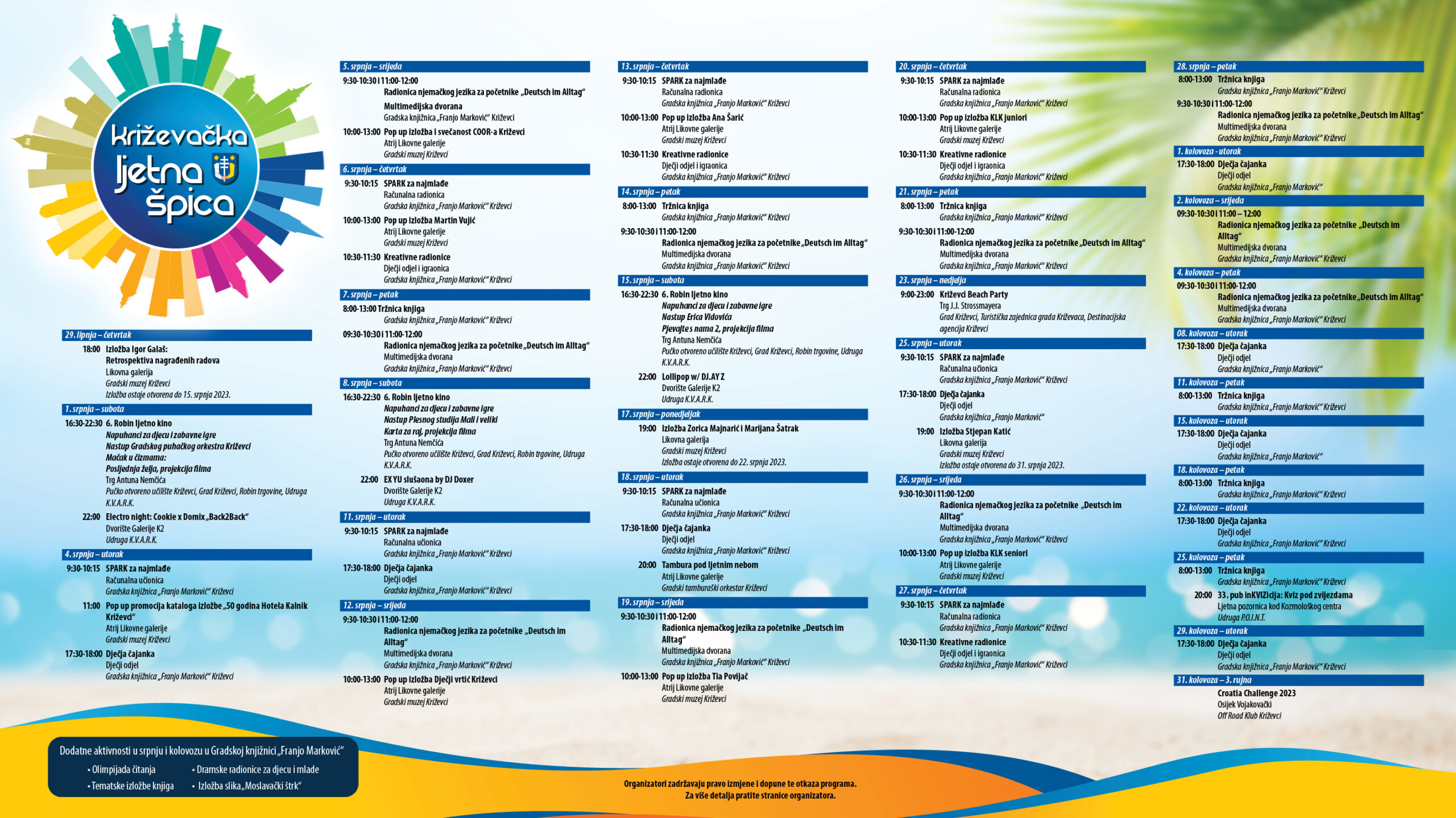 Gradski muzej priprema pop up izložbe, udruga K.V.A.R.K. glazbene slušaonice, knjižnica čajanke, radionice njemačkog jezika i tržnice knjiga, a Gradski tamburaški orkestar koncert pod ljetnim nebom. Grad Križevci će na jedan dan centar pretvoriti u plažu i ponovo organizirati Križevački Beach Party.