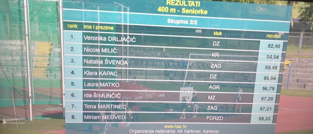 Veronika Drljačić potvrdila je i danas u Karlovcu na pojedinačnom seniorskom prvenstvu Hrvatske da je u odličnoj formi uoči mlađeseniorskog prvenstva Europe u finskom Espoou od 13. do 16. srpnja i da joj, naravno, nema ravne u domaćoj konkurenciji na 400 metara. Veronika je uvjerljivo pobijedila i osvojila četvrti uzastopni naslov državne prvakinje u toj disciplini i ponovno dionicu istrčala za manje od 53 sekunde, s novim osobnim rekordom 52.90. Trčala je sedam stotinki brže nego nedavno u poljskom Chorzowu na ekipnom prvenstvu Europe (2. liga). Šesta je u utrci na 400 metara bila Ida Šimunčić u vremenu 57.20.