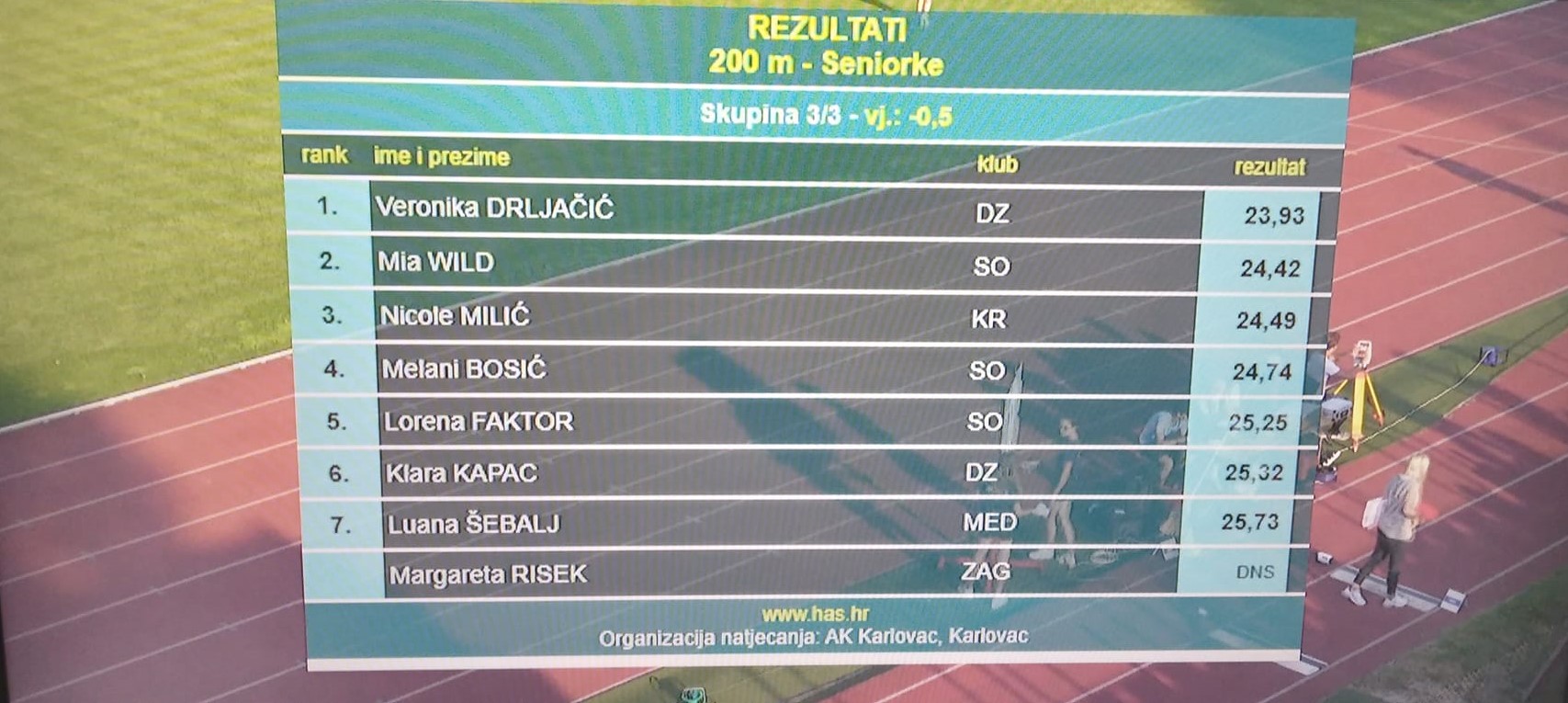 To joj je peti uzastopni naslov državne seniorske prvakinje u toj disciplini i, zacijelo, je prvo ime državnog prvenstva jer je jučer pobijedila s osobnim rekordom i na 400 metara te u klupskoj štafeti 4 x 100 metara. Hrvoje Kašik iz AK Križevci osvojio je osmo mjesto na 200 metara s rezultatom 22.88. Uvjerljivo je pobijedio Varaždinac Roko Farkaš s 21.22.