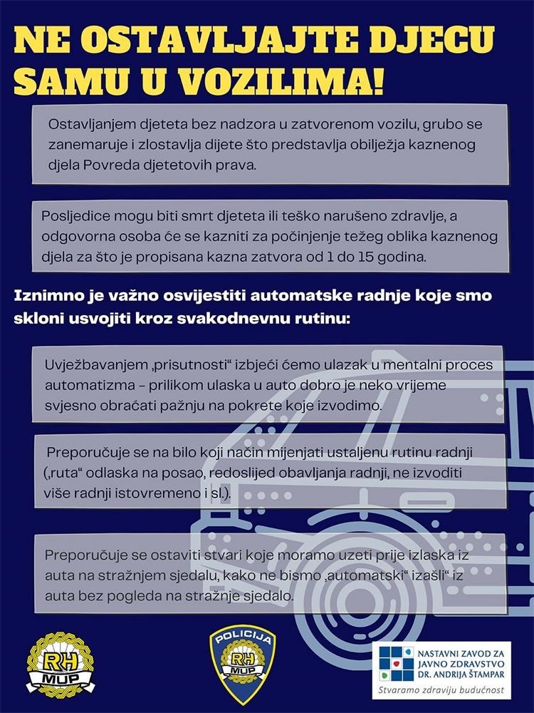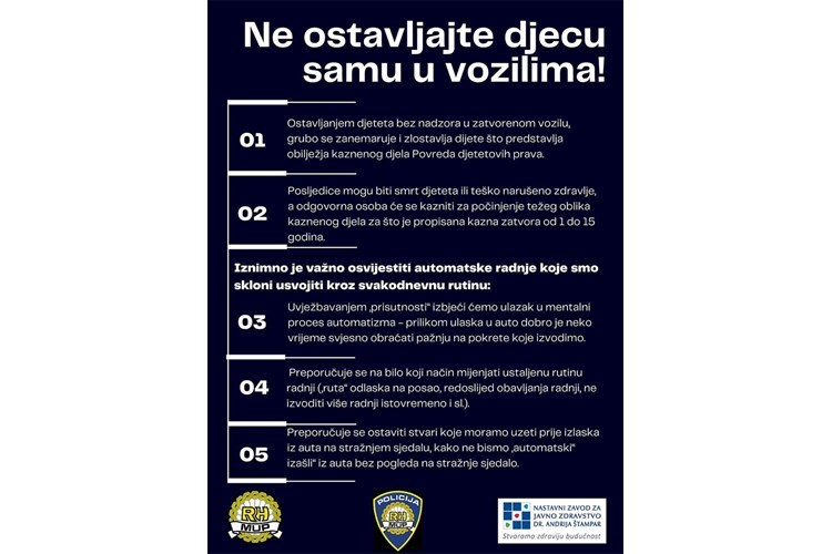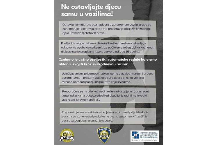 – Uvježbavanjem “prisutnosti” izbjeći ćemo ulazak u mentalni proces automatizma. Prilikom ulaska u auto dobro je neko vrijeme obraćati pažnju na pokrete koje izvodimo. Preporučuje se na bilo koji način mijenjati ustaljeno ponavljanje radnji (put odlaska na posao, redoslijed obavljanja radnji, ne izvoditi više radnji istovremeni i sl.). Preporučuje se ostaviti stvari koje moramo uzeti prije izlaska iz auta na stražnjem sjedalu, kako ne bismo izašli iz auta bez pogleda na stražnje sjedalo, savjetuju iz policije.