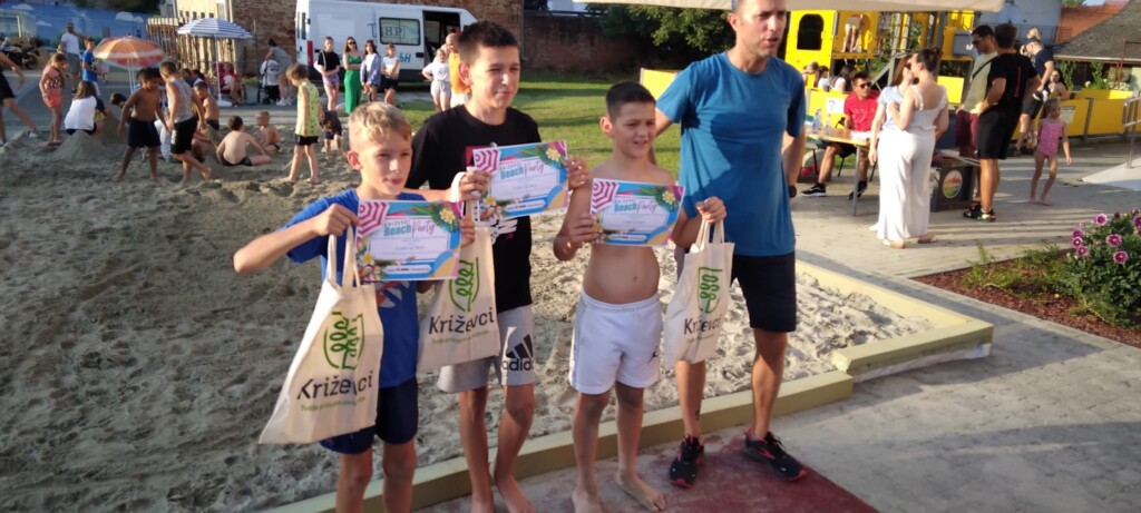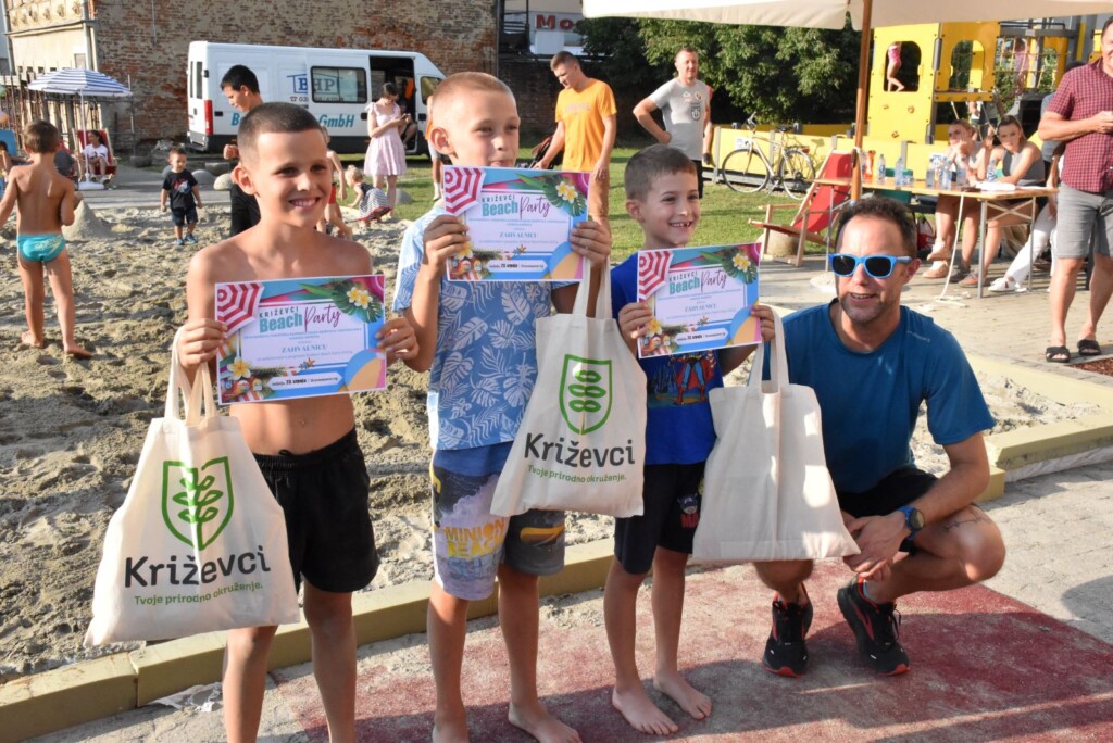 Križevci Beach Party i ove je godine privukao sportaše i rekreativce na natjecanjima na pješčanoj podlozi – odbojci na pijesku i skoku u dalj. Među dječacima od 1. do 4. razreda najdalje je skočio Matija Jendrek (3.45 m), zatim Arian Kraljić (3.11 m) pa Viktor Šoronda (2.78 m). Još su skakali Viktor Novosel, Dane Jurić, Sebastian Paraminski, Riduan Selmani, Emanuel Katana, Rafael Furmeg i Noa Cigler. Od djevojčica od 1. do 4. razreda pobijedila je Petra Pavlinić s preskočenih 2.73 m, druga je bila Julija Siladi s 2.51 m i treća Sara Biškup koja je preskočila 2.14 m.