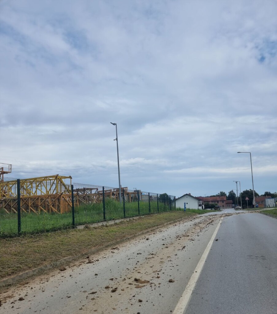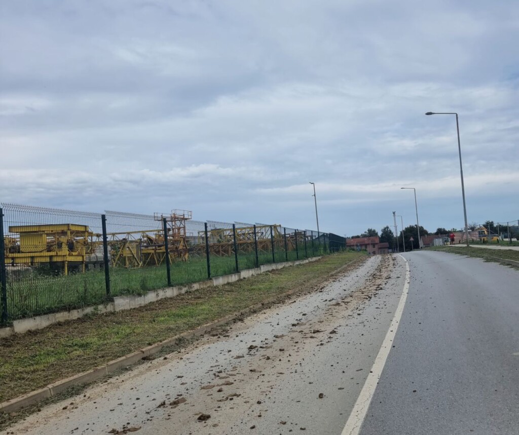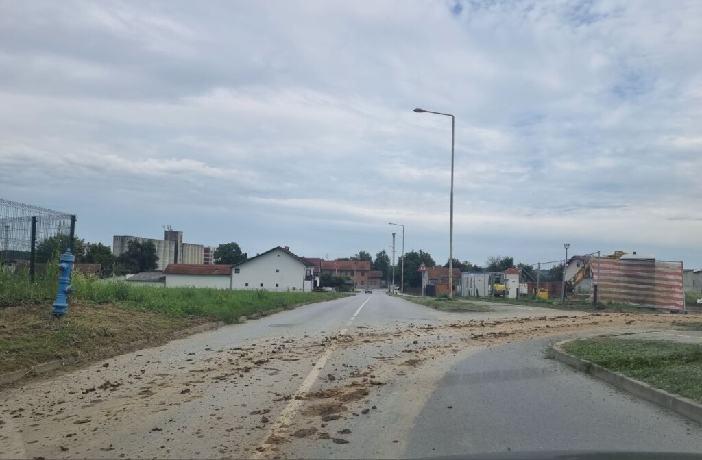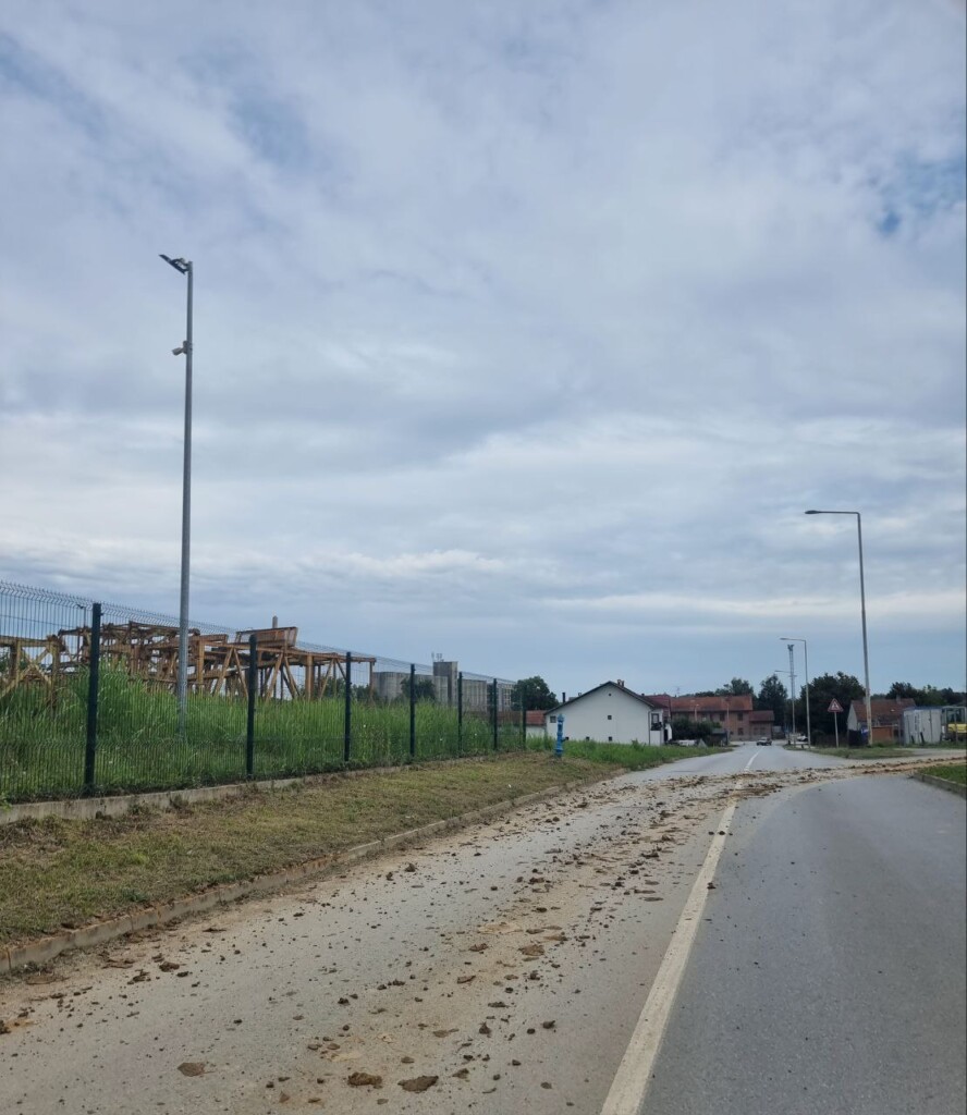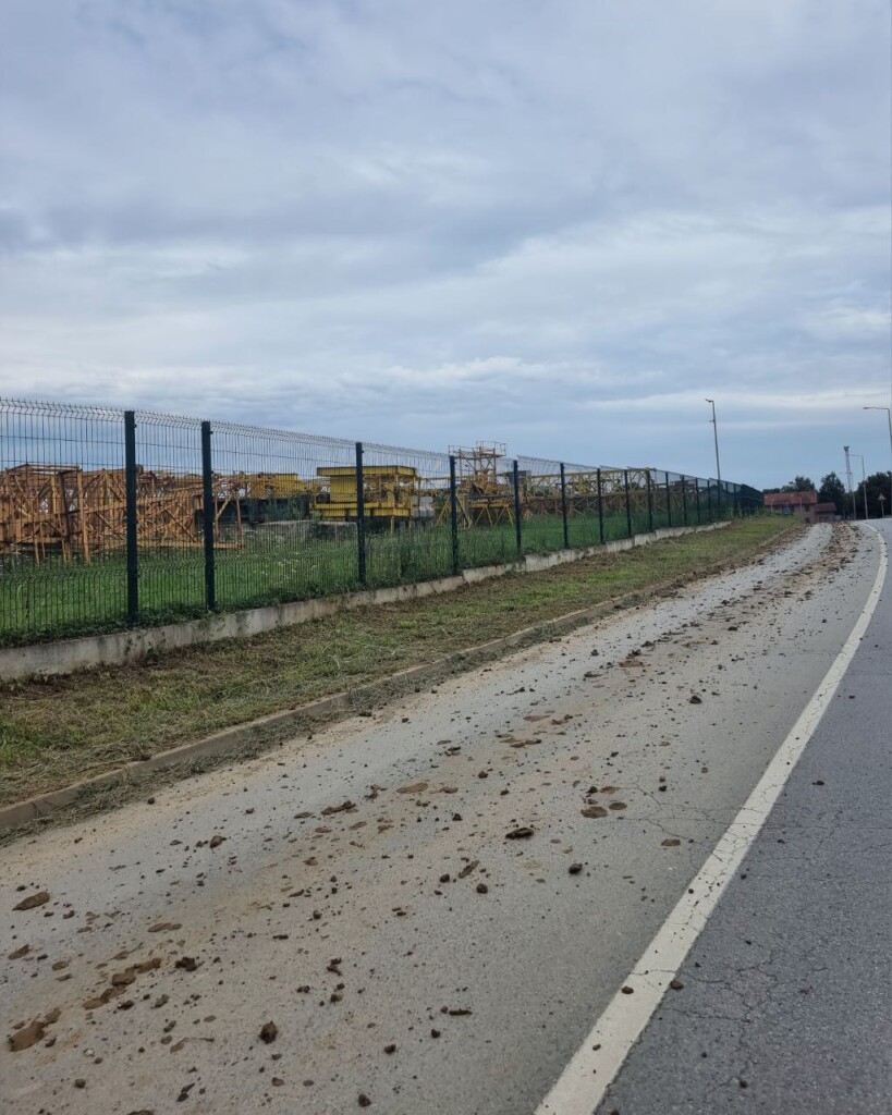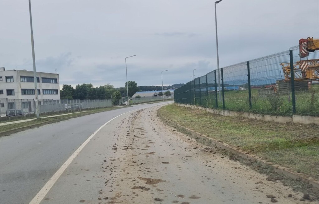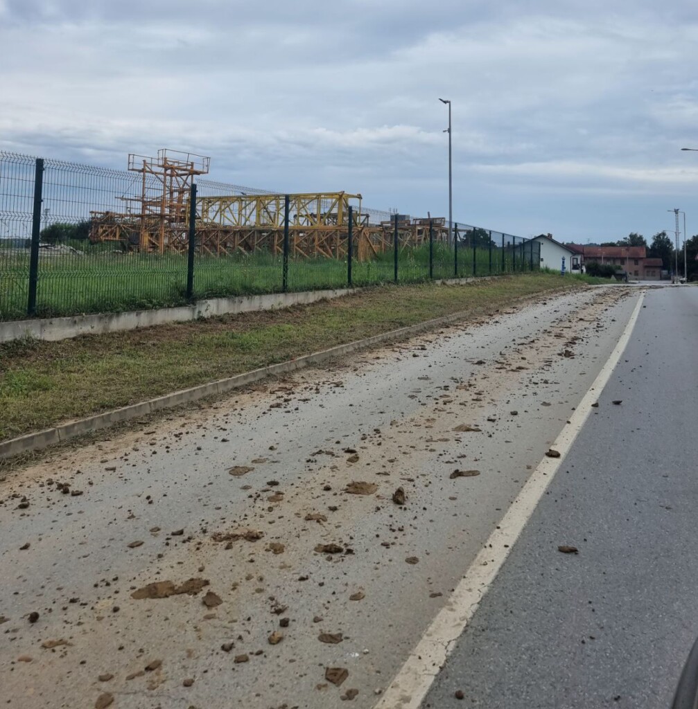 Izvođač koji je zadužen za odvoz zemlje, prije izlaska na jednu od prometnijih cesta u gradu, nije očistio blato sa svojih guma, a kao što vidimo na slikama, ne radi se o zanemarivoj količini. Štoviše, cesta u najvećoj gospodarskoj zoni u gradu, na potezu od dvjestotinjak metara, jučer se “kupala” se u grudama blata, koje, do danas, nije bilo očišćeno.
