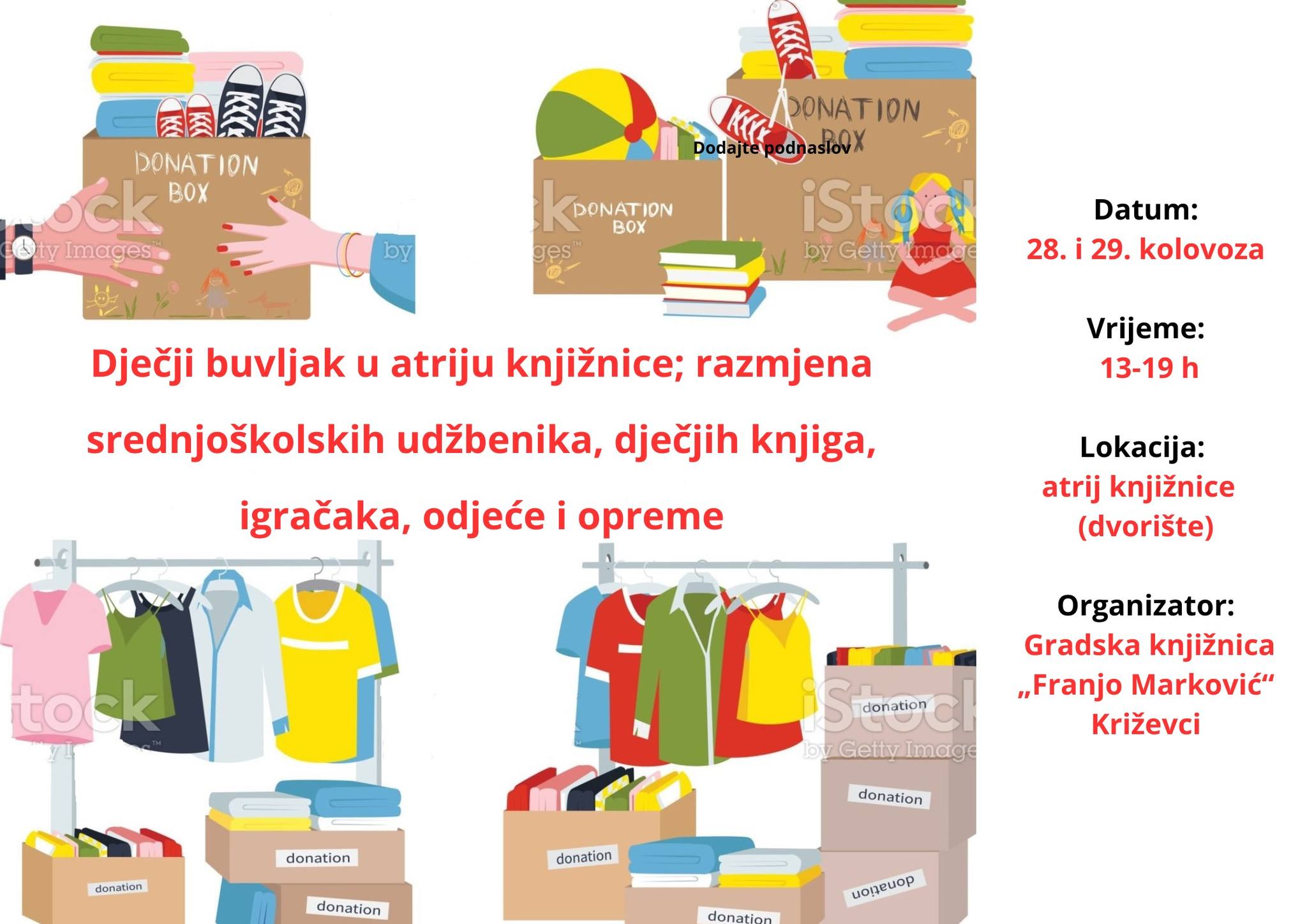 Uoči početka nove školske godine Gradska knjižnica “Franjo Marković”, u želji da pomogne roditeljima i olakša im nabavku sve potrebne opreme, pokreće Dječji buvljak 28. i 29. kolovoza u svom dvorištu u atriju knjižnice. Ideja je da se ondje razmjenjuju srednjoškolski udžbenici, dječje knjige, odjeća i oprema te igračke.