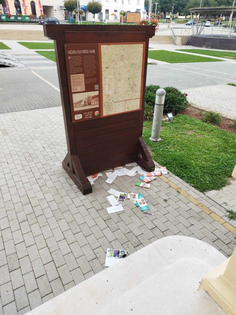 “Ne preostaje drugo nego da opet apeliramo na roditelje da pripaze na svoju djecu (hvala kamerama). Drvena klupa ispred zgrade, informativno kolo križevačkih vizura, dječje igralište, lampe, travnjak i cvjetnjak ispred zgrade su imovina svih nas, bilo da je gradsko ili vlasništvo Turističke zajednice grada Križevaca“, podsjeća Gjigaš. Turistički ured priprema, štampa i besplatno daje na raspolaganje za sve turiste, posjetitelje i građane promotivne materijale, karte grada, biciklističkih staza, letke i informacije na osam svjetskih jezika. U 2022. to ih je koštalo 56.056 kuna pa trošak tiskanja novih materijala nije zanemariv. Budući da je samo ovaj tjedan uništena hrpa materijala, naručen je novi viši stalak.