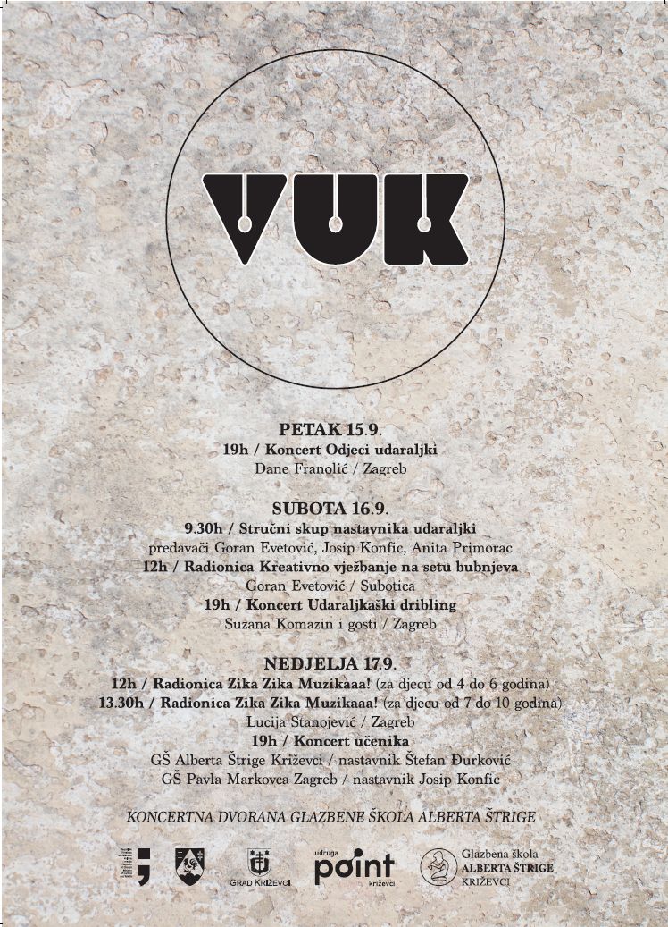 Koncertom studenta muzičke akademije u Zagrebu Daneta Franolića pod nazivom Odjeci udaraljki u 19 sati u Koncertnoj dvorani Glazbene škole Alberta Štrige večeras se otvara 13. udaraljkaški festival Večeri udaraljkaša u Križevcima (VUK). Festival je nastao 2011. godine s ciljem promoviranja domaće i inozemne udaraljkaške scene i na njemu se, osim eminentnih solista udaraljkaša u Hrvatskoj i šire, predstavljaju i udaraljkaški ansambli i sastavi, mladi talentirani studenti Muzičke Akademije u Zagrebu te učenici srednjih i osnovnih škola iz cijele Hrvatske i regije izvodeći klasični i popularni udaraljkaški repertoar.