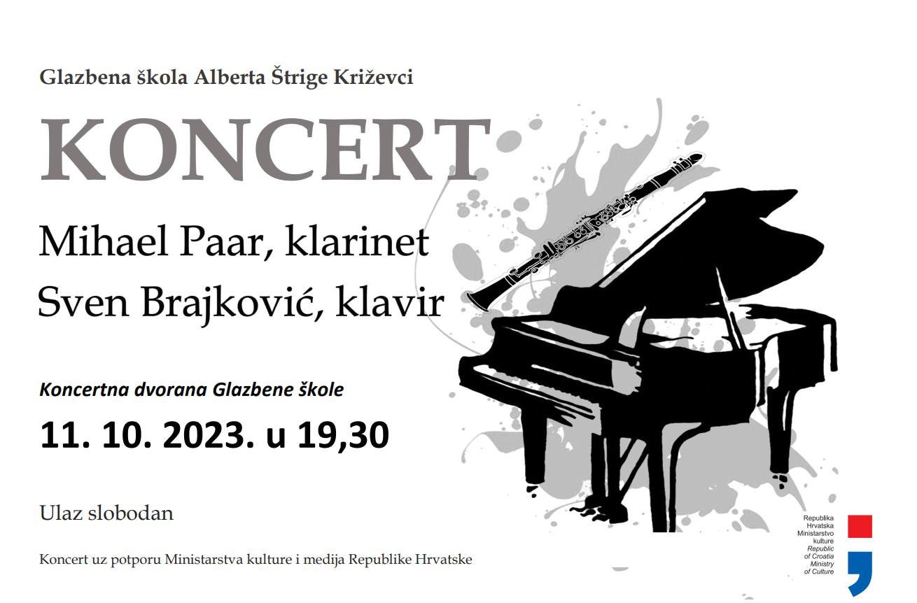 Večeras, u srijedu, 11. listopada 2023. godine u Koncertnoj dvorani Glazbene škole Alberta Štrige u Križevcima održat će se koncert dua klarinet-glasovir koji će izvesti klarinetist Mihael Paar i pijanist Sven Brajković. Početak koncerta je zakazan u 19:30 sati, održat će se uz potporu Ministarstva kulture i medija, a ulazak je slobodan.
