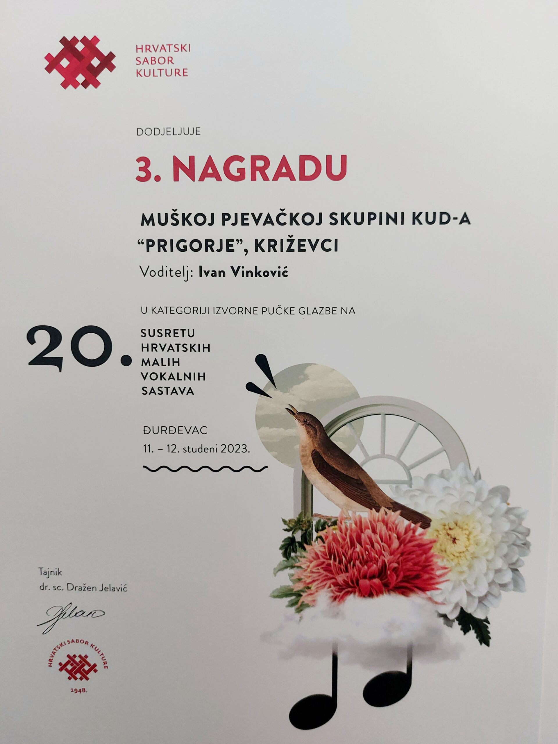 Muškoj pjevačkoj skupina KUD-a Prigorje Hrvatski sabor kulture je dodijelio treću nagradu na Susretu hrvatskih malih vokalnih sastava u nedjelju u Đurđevcu. Nastupili su u kategoriji izvorne pučke glazbe s još deset grupa iz različitih krajeva Hrvatske i izveli tri izvorna pučka napjeva iz okolice Križevaca. Voditelj skupine je Ivan Vinković. “Ponosni smo na ovaj uspjeh, no nastavljamo s pripremama za nadolazeće nastupe“, poručuju Prigorci.