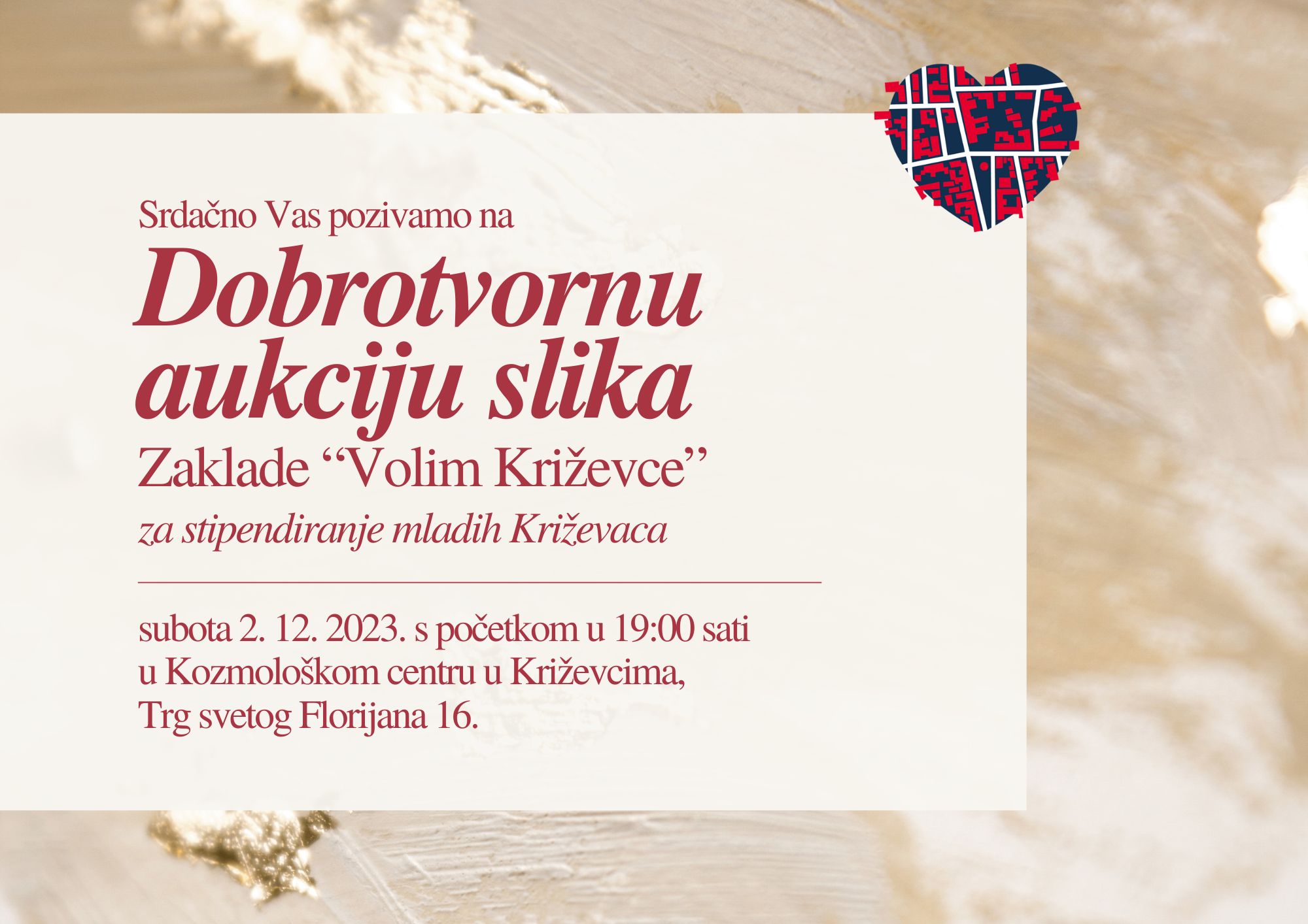 Zaklada za lokalni razvoj i solidarnost „Volim Križevce“ poziva na dobrotvornu aukciju slika za stipendiranje mladih Križevaca, koja će se održati u subotu, 2. prosinca 2023. godine u Kozmološkom centru u Križevcima, Trg svetog Florijana 16, s početkom u 19 sati.