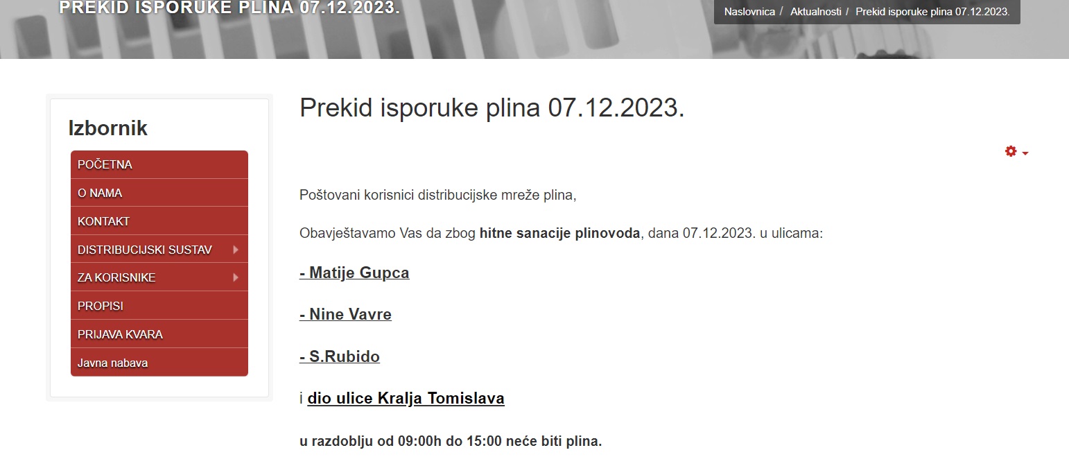 Križevačke ulice Matije Gupca, Nine Vavre, Sidonije Rubido i dio Ulice kralja Tomislava danas, u četvrtak 7. prosinca, neće imati plin, obavještava tvrtka Radnik-plin na svojoj stranici. Razlog prekida isporuke ovog energenta je, navode, hitna sanacija plinovoda. Plina neće biti od 9 do 15 sati, a ukoliko će građani i nakon završetka prekida imati poteškoće s korištenjem plina, trebaju nazvati dežurnu službu na broj telefona 048/ 716-197.