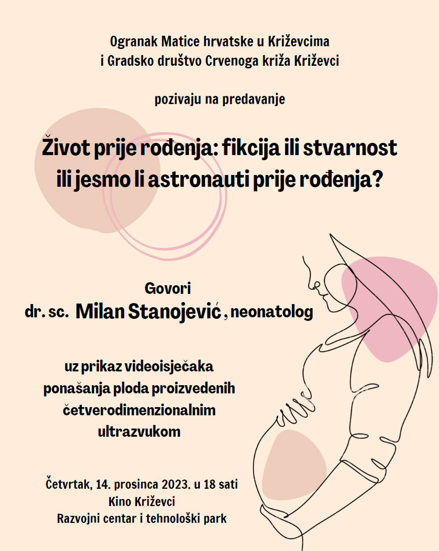 Ogranak Matice hrvatske i Gradsko društvo Crvenoga križa pozivaju na predavanje pod nazivom “Život prije rođenja: fikcija ili stvarnost ili jesmo li astronauti prije rođenja?”. Predavač je dr. sc. Milan Stanojević, neonatolog koji je kao liječnik i pedijatar radio od do 2000. radio u Općoj bolnici „Dr. Tomislav Bardek” u Koprivnici, a umirovljen je 2018. kao voditelj odjela neonatologije u Kliničkoj bolnici “Sveti Duh”. Počasni je profesor na nekoliko sveučilišta i instituta. Organizatori u najavi predavanja navode da će predavač pokušati prikazati kako se plod kreće u maternici prije rođenja i do kojih se zaključaka došlo promatrajući ga četverodimenzionalnim ultrazvukom.