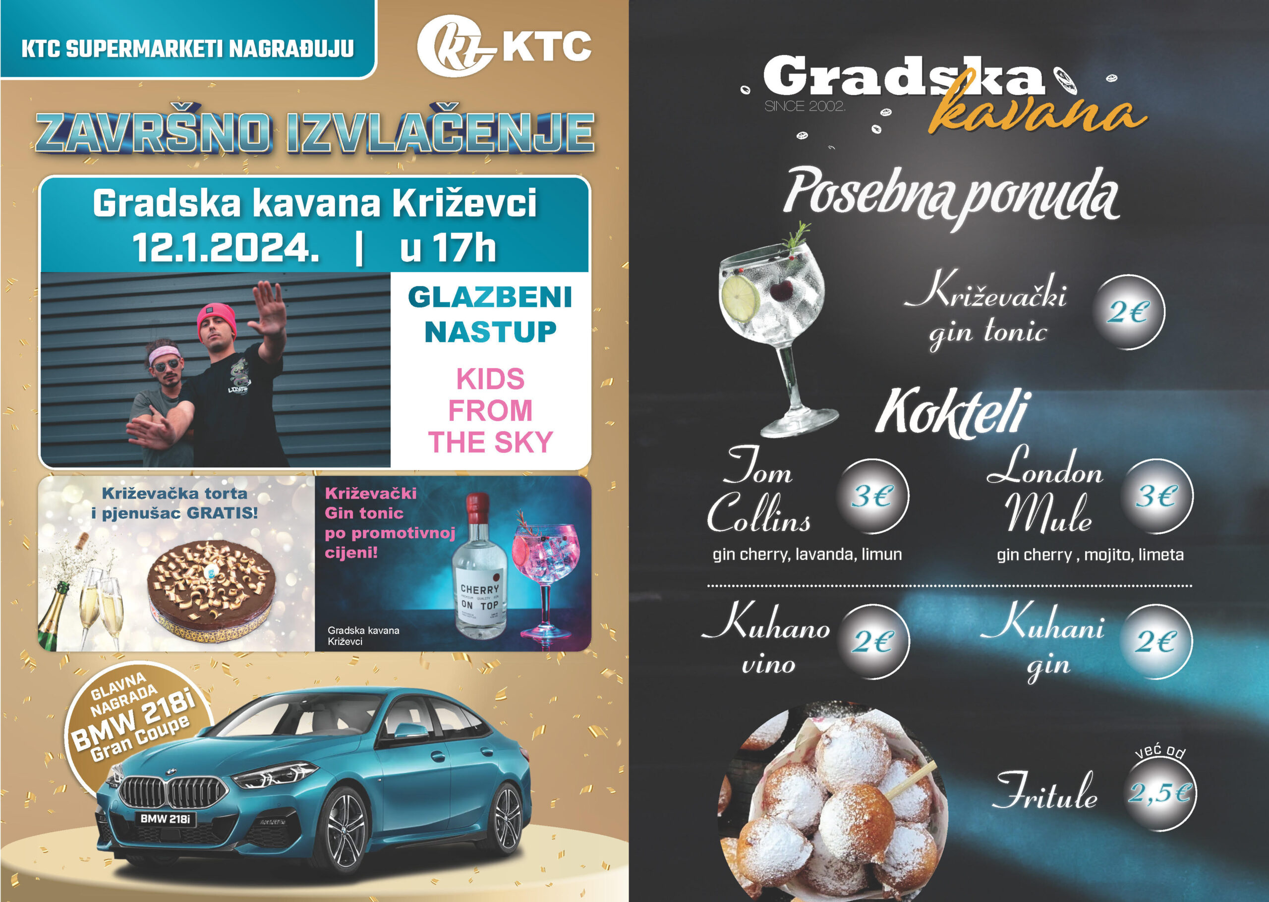 Trgovački lanac KTC poziva građane na finalno izvlačenje velike nagradne igre KTC supermarketa danas u 17 sati u Gradsku kavanu kad će se znati kamo putuje glavna nagrada automobil BMW. Za ovu posebnu priliku pripremili su i posebnu ponudu pa se danas uz koktele toči i gin križevačkog proizvođača. Pripremili su slatka iznenađenja uz nastup odličnog benda Kids from the sky.