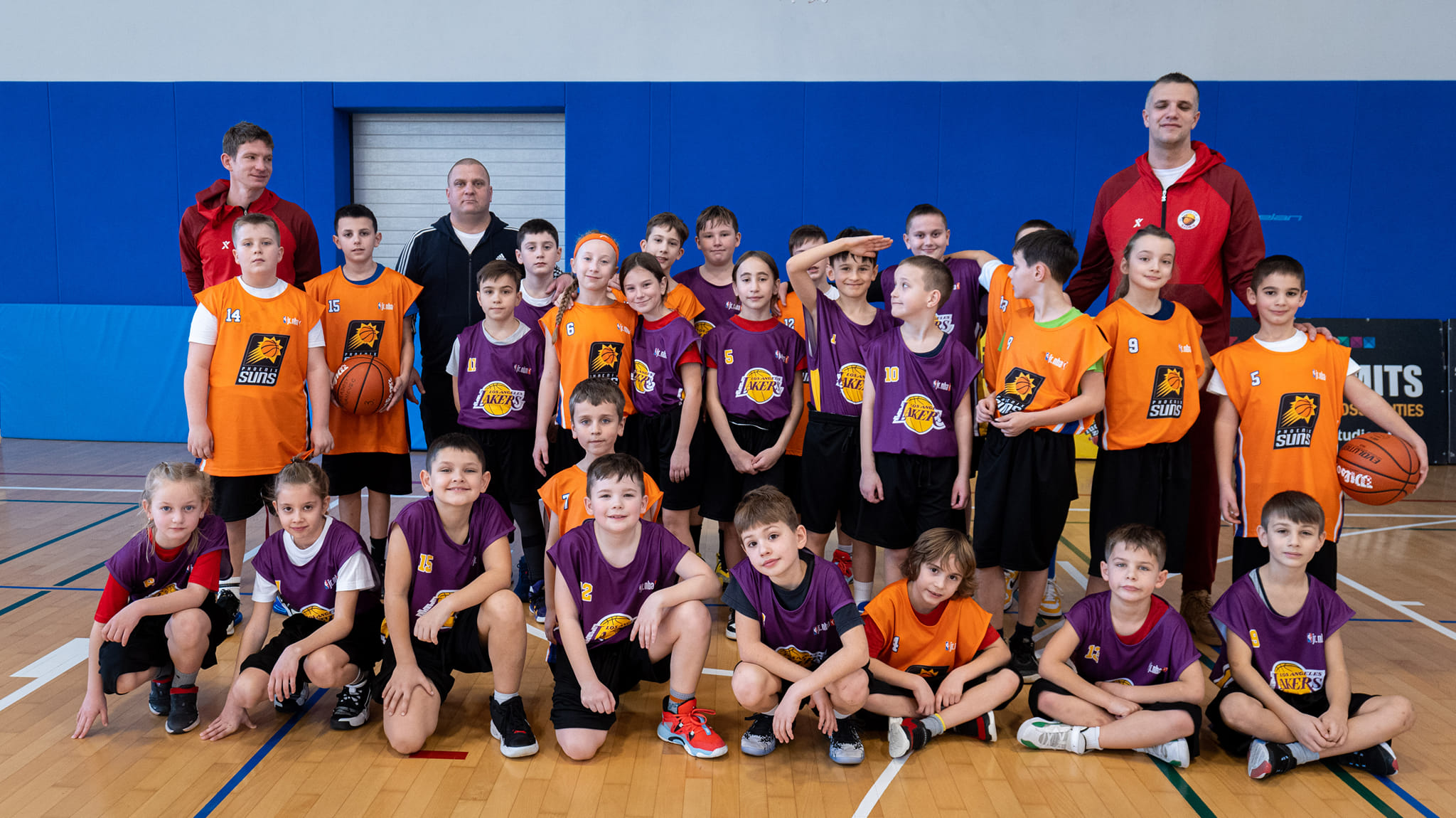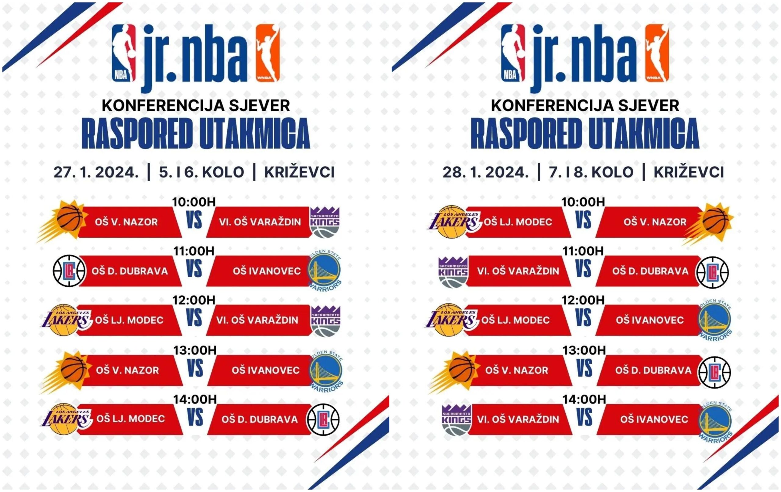 Tako su osnovnoškolci iz Modeca u ovom slučaju Los Angeles Lakersi, dok Nazorovci nose dresove Phoenix Sunsa. Ovaj vikend u Križevcima će još nastupiti VI. OŠ Varaždin (Sacramento Kings), OŠ Ivanovec (Golden State Warriors) te OŠ Donja Dubrava (LA Clippers), a utakmice se igraju u subotu 27. siječnja, odnosno u nedjelju 28. siječnja po sljedećem rasporedu: